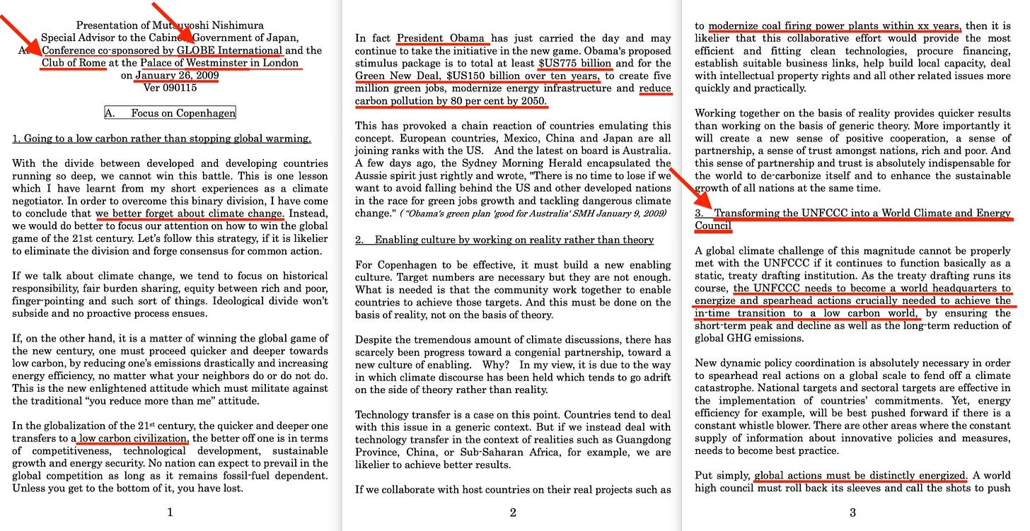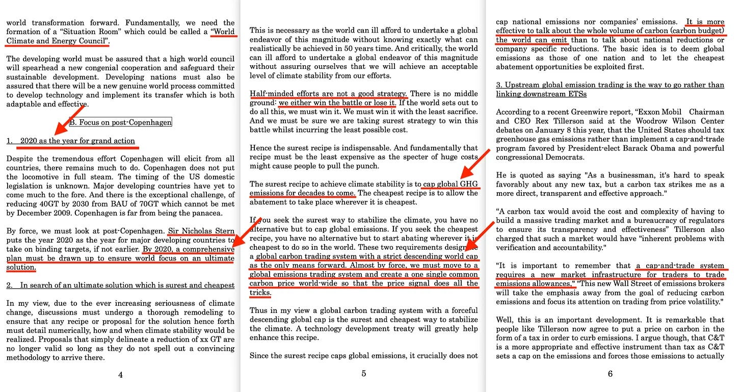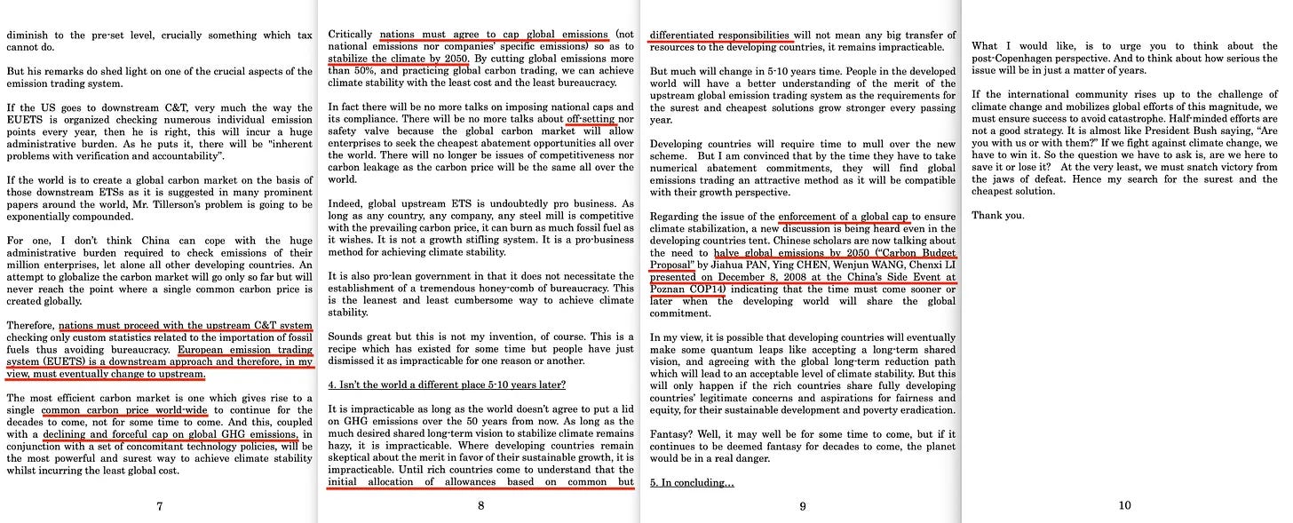 «Το 2020 ως έτος για μεγάλη δράση... Ο Sir Nicholas Stern... πρέπει να καταρτιστεί ένα ολοκληρωμένο σχέδιο για να διασφαλιστεί η παγκόσμια εστίαση σε μια τελική λύση... ένα παγκόσμιο σύστημα εμπορίας άνθρακα με αυστηρά φθίνοντα παγκόσμια ανώτατα όρια ως το μόνο μέσο προς τα εμπρός... πρέπει να προχωρήσουμε σε ένα παγκόσμιο σύστημα εμπορίας εκπομπών και να δημιουργήσουμε μια ενιαία κοινή τιμή άνθρακα παγκοσμίως, έτσι ώστε το σήμα της τιμής να κάνει όλα τα κόλπα... Μετατροπή της UNFCCC σε ένα Παγκόσμιο Συμβούλιο για το Κλίμα και την Ενέργεια»