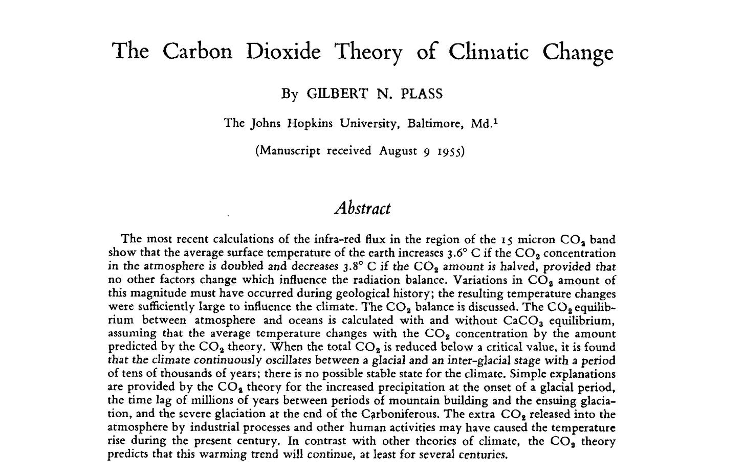 1955 Η θεωρία της κλιματικής αλλαγής του διοξειδίου του άνθρακα του Plass [15].