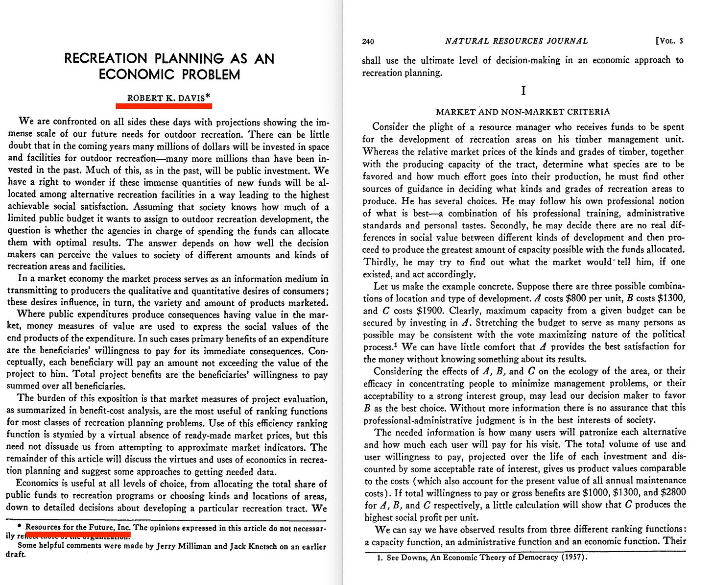 Η αποτίμηση των υπηρεσιών αναψυχής ξεκίνησε με μια έκθεση του οργανισμού Resources for the Future, ο οποίος παρεμπιπτόντως ήταν αποδέκτης σχεδόν κωμικών επιπέδων χρηματοδότησης από τα Ιδρύματα Ford και Rockefeller.