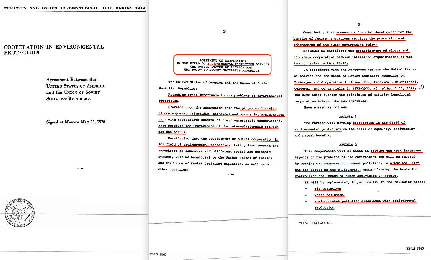 Θα έπρεπε να είναι ένα από τα πιο ευρέως διαδεδομένα έγγραφα στη σύγχρονη ιστορία, αλλά ζει στη σκιά της συμφωνίας SALT και της εκδήλωσης UNCED στη Στοκχόλμη. Αυτό που συμφώνησαν η Μόσχα και η Ουάσινγκτον ήταν η «κοινή ανάπτυξη και εφαρμογή στους τομείς των βασικών και εφαρμοσμένων επιστημών» για τον «έλεγχο των επιπτώσεων των ανθρώπινων δραστηριοτήτων στη φύση» μέσω της ανάπτυξης «νομικών και διοικητικών μέτρων για την προστασία της ποιότητας του περιβάλλοντος».