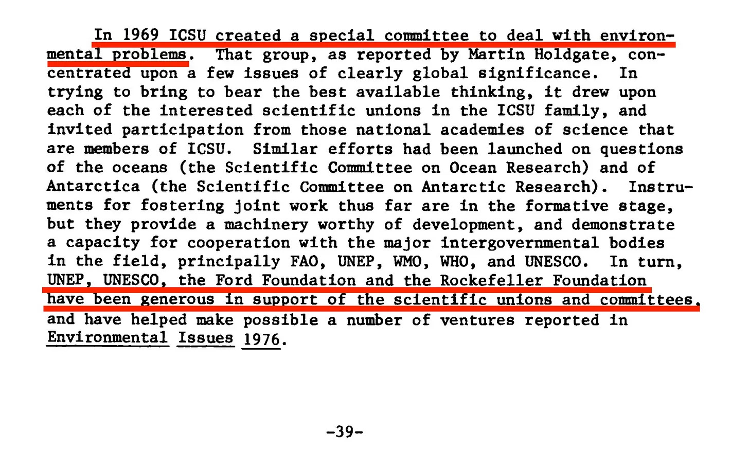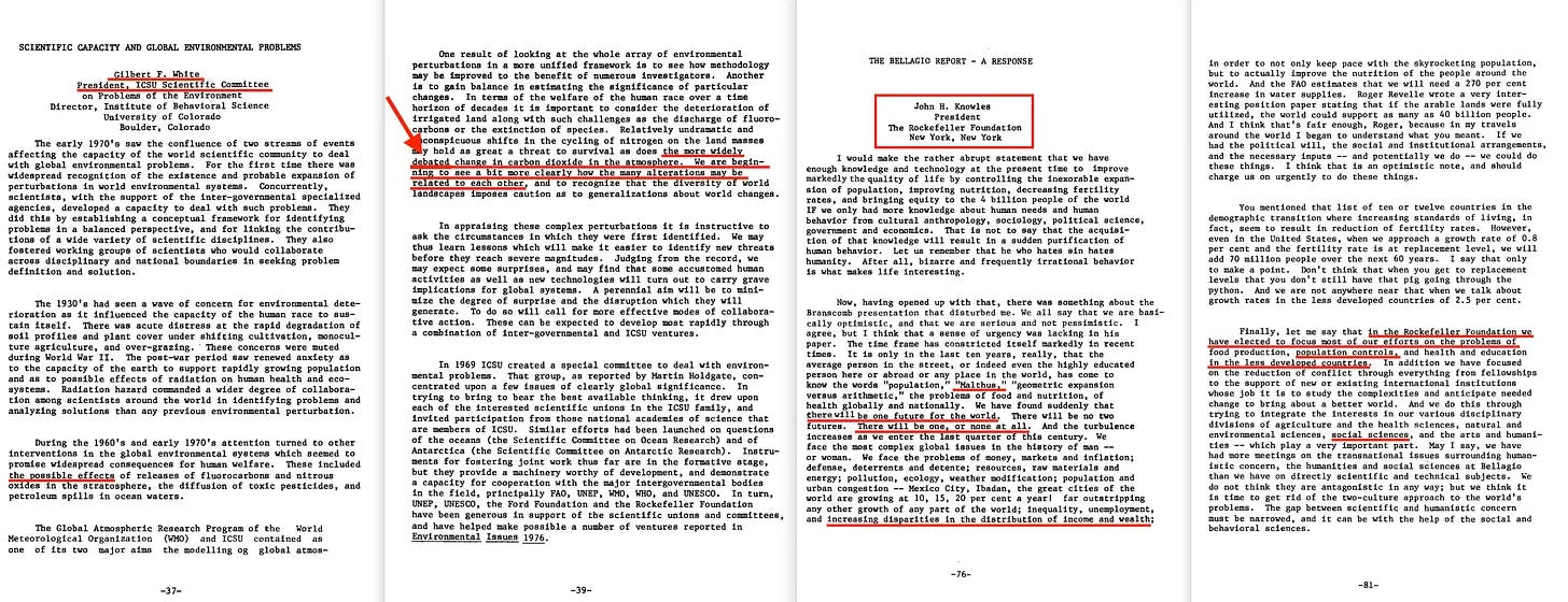Οι επιπτώσεις του διοξειδίου του άνθρακα στην ατμόσφαιρα δεν είναι καθόλου βέβαιες, όπως δήλωσε αυτή τη φορά ο πρόεδρος του ICSU, Gilbert White. Επιπλέον, λεπτομέρειες σχετικά με τις ερευνητικές προσπάθειες του Rockefeller για τον έλεγχο του πληθυσμού σε λιγότερο ανεπτυγμένες χώρες.