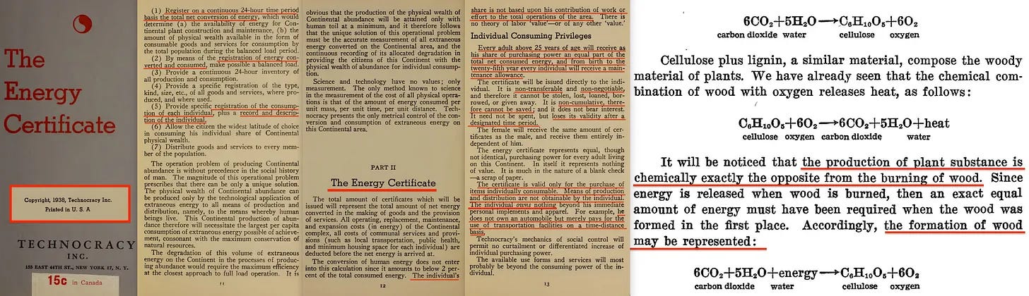 Κλειδί για την κατανόηση πολλών γεγονότων είναι η έννοια του «ενεργειακού πιστοποιητικού», που σκιαγραφήθηκε από την Technocracy, Inc το 1936. Αυτά, στην ουσία, περιγράφουν τα CBDCs που υποστηρίζονται από τον άνθρακα. Σίγουρα, αυτά ήταν πρώιμα και με πολλές εκκρεμείς λεπτομέρειες - αλλά κατανόησαν τη θεμελιώδη ιδέα.
