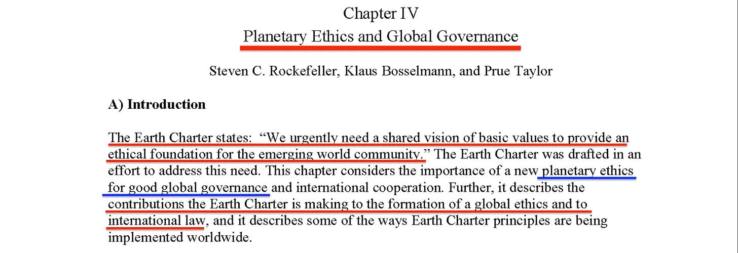 Αυτό όχι µόνο επαναλαµβάνει το κάλεσµα της Χάρτας της Γης για πλανητική ηθική, αλλά προτείνει ακόµη και «µια νέα παγκόσµια ατζέντα» και «ένα Παγκόσµιο Κοινοβούλιο εκλεγµένο από τους ανθρώπους, έναν φόρο εισοδήµατος για να βοηθηθούν οι υπανάπτυκτες χώρες, το τέλος του βέτο στο Συµβούλιο Ασφαλείας, µια περιβαλλοντική υπηρεσία και ένα παγκόσµιο δικαστήριο µε εξουσίες επιβολής».