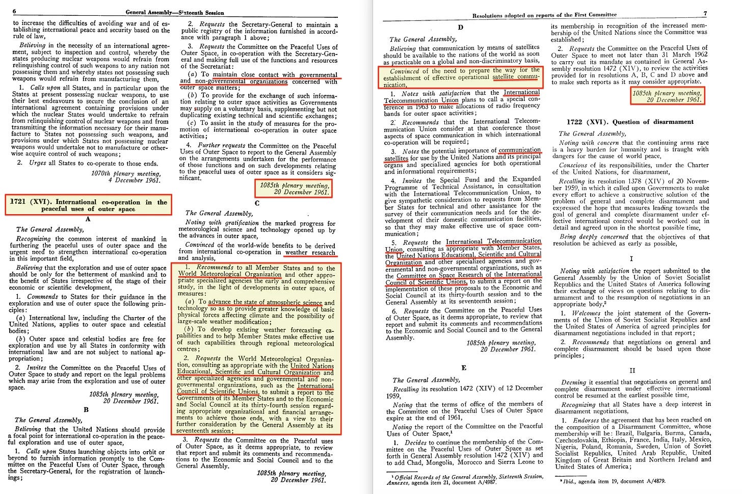 1961 Διεθνής συνεργασία για την ειρηνική χρήση του διαστήματος [20].