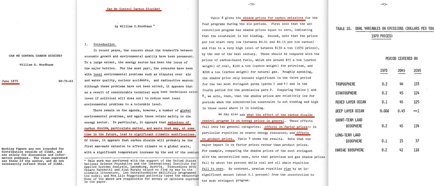 Το κομβικό, πρώτο έγγραφο σχετικά με την τιμολόγηση του άνθρακα δημοσιεύθηκε το 1975, με την ευγενική χορηγία του πρόσφατα ιδρυμένου Διεθνούς Ινστιτούτου για την Εφαρμοσμένη Ανάλυση Συστημάτων (International Institute for Applied Systems Analysis).