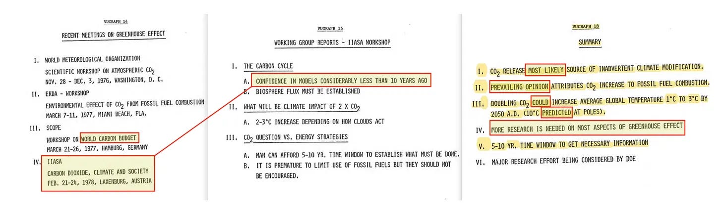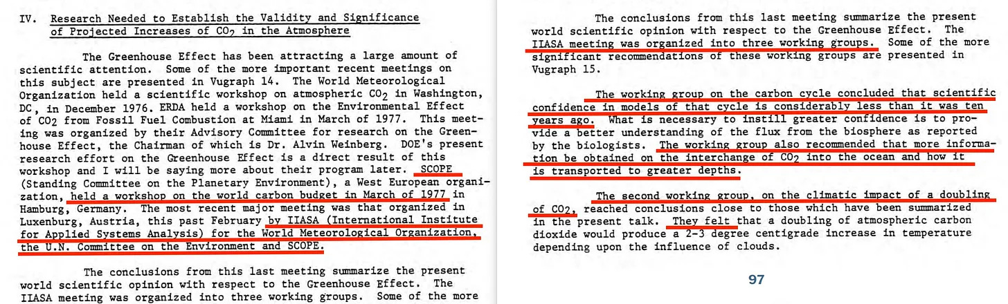 Σε γενικές γραμμές, οι εκθέσεις αυτές αποτελούσαν ελάχιστα περισσότερα από απόλυτες εικασίες, που υποστηρίζονταν αποκλειστικά από την «αρχή της προφύλαξης», η οποία εφαρμόστηκε πάντα μόνο προς μία κατεύθυνση. Και αυτό ακολούθησε ένα εργαστήριο της SCOPE το 1977, το οποίο προσπαθούσε να καθιερώσει έναν «Παγκόσμιο Προϋπολογισμό Άνθρακα» - σε μια εποχή που ουσιαστικά τίποτα δεν ήταν κατανοητό για τον παγκόσμιο κύκλο του άνθρακα.