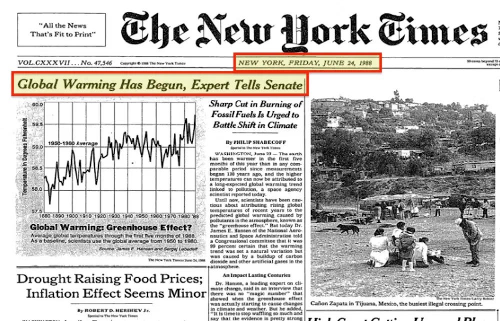 1988 Η υπερθέρμανση του πλανήτη «αρχίζει επίσημα», σύμφωνα με τους New York Times.