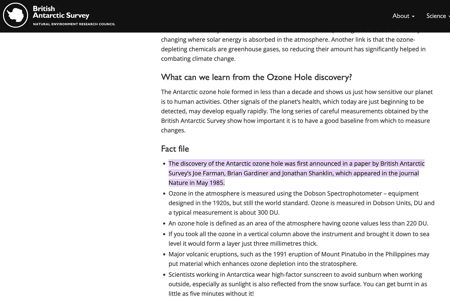 1985 Ανακάλυψη της τρύπας του όζοντος [64].