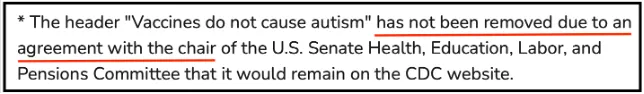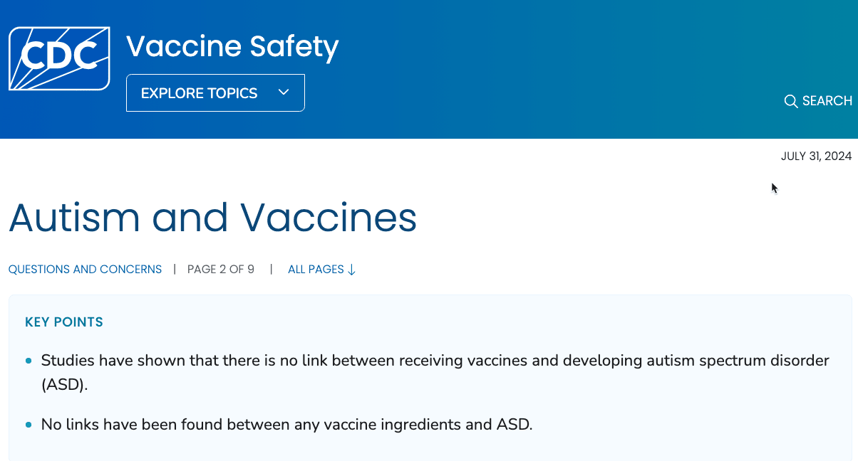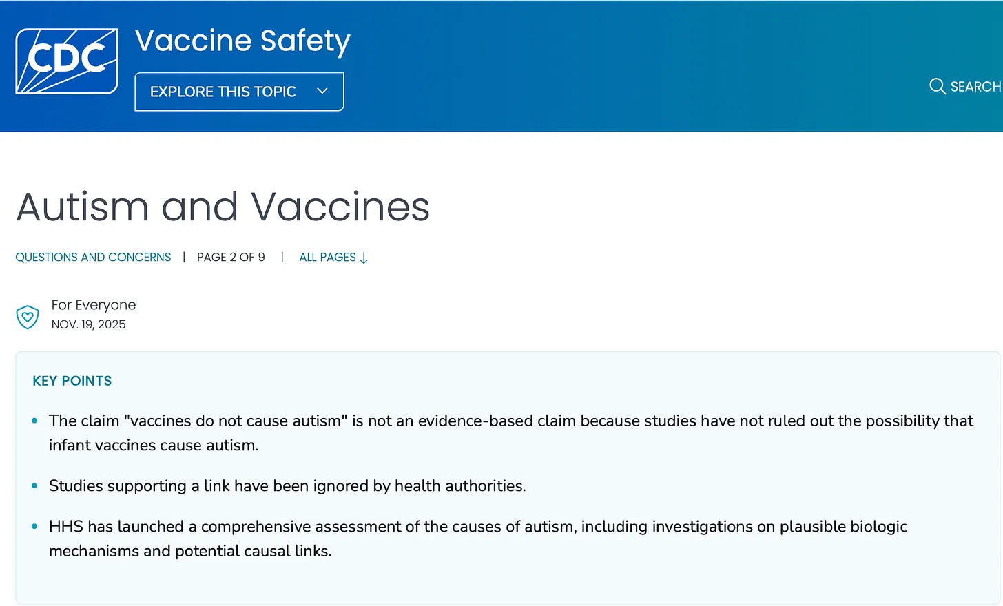 Σε μια ενημέρωση της ιστοσελίδας που δημοσιεύθηκε στις 19 Νοεμβρίου 2025, ο οργανισμός δηλώνει πλέον ότι ο μακροχρόνιος ισχυρισμός «τα εμβόλια δεν προκαλούν αυτισμό» «δεν είναι τεκμηριωμένος», επειδή οι επιστημονικές μελέτες «δεν έχουν αποκλείσει την πιθανότητα τα εμβόλια για βρέφη να προκαλούν αυτισμό».