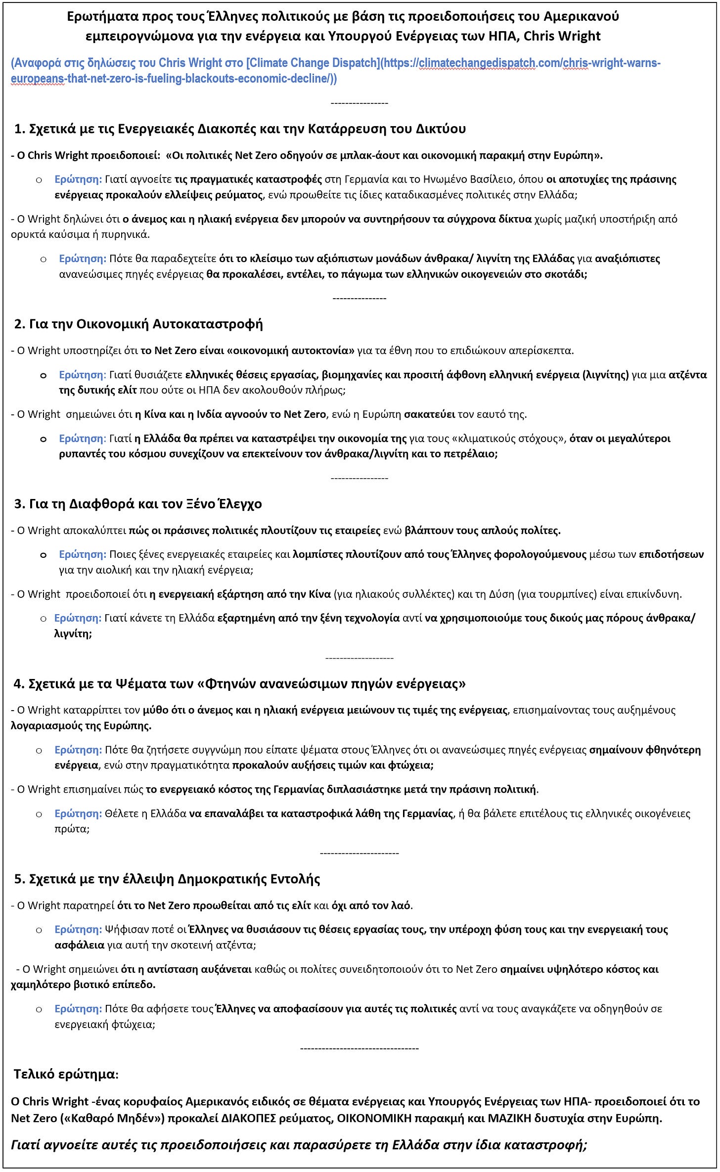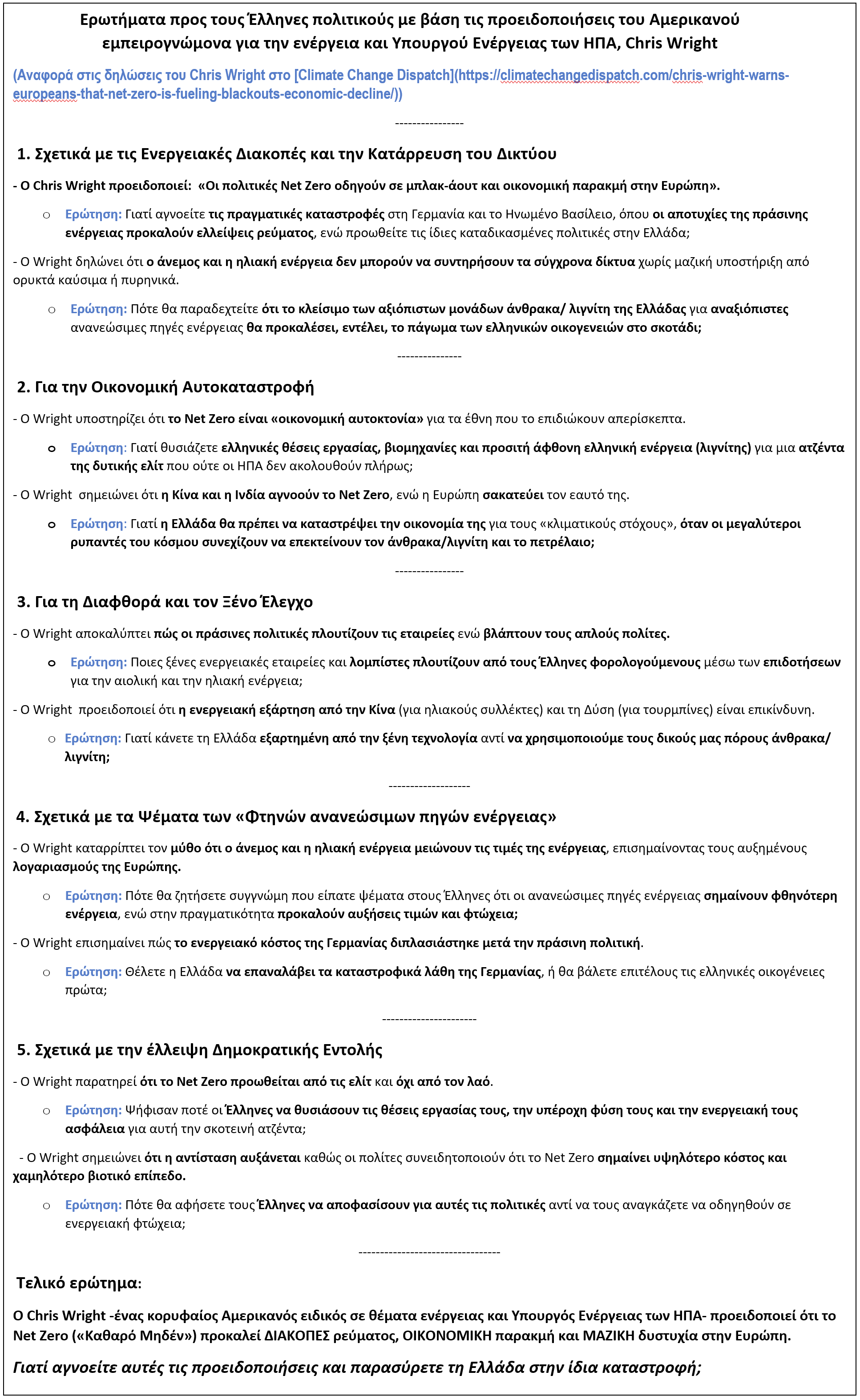 Ο Chris Wright Προειδοποιεί τους Ευρωπαίους ότι το Net Zero (“Καθαρό Μηδέν”) Τροφοδοτεί τις Διακοπές Ρεύματος και την Οικονομική Παρακμή