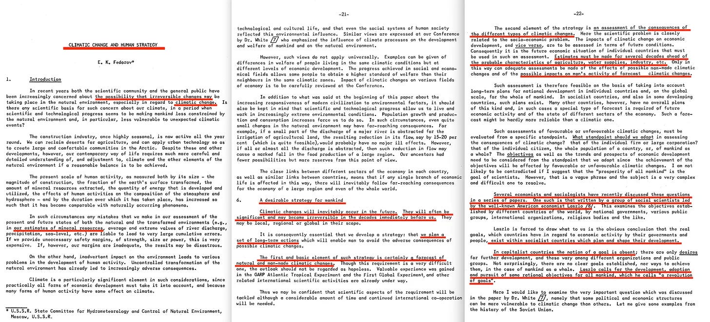 Αν προσθέσουμε την έκθεση του IIASA από το 1978, στην οποία δηλώνεται ότι είναι λιγότερο σίγουροι για το μοντέλο του κύκλου του άνθρακα από ό,τι πριν από μια δεκαετία, φαίνεται κάπως υπερβολικό να συζητάμε για αρνητικές επιπτώσεις στην ανθρώπινη υγεία, τη χρήση της γης, τη δασοκομία, την ενέργεια, τις επιπτώσεις στην παγκόσμια οικονομία - για να καταλήξουμε με μια σχετική δήλωση. Και αυτό χωρίς να ξεχνάμε το πρώτο έγγραφο επισκόπησης που συνέταξε ο Federov, ένας Σοβιετικός υπήκοος, το οποίο ασχολείται με το κλίμα και τη δημόσια πολιτική - ένα γεγονός που με προβληματίζει κάπως, δεδομένης της συμφωνίας ΗΠΑ-ΕΣΣΔ για την προστασία του περιβάλλοντος που υπογράφηκε στις 23 Μαΐου 1972, η οποία τελικά περιγράφει -