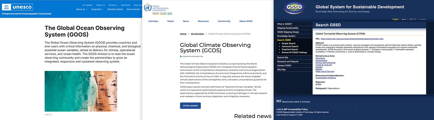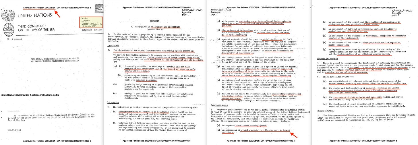 Ωστόσο, κατάφερα να εντοπίσω ένα έγγραφο της UNCLOS από το 1975 [22], το οποίο αποχαρακτηρίστηκε μόλις το 2002 (συμπτωματικά, όταν συζητήθηκε το GEOSS), το οποίο περιγράφει τη σημασία του GEMS για την παρακολούθηση της «παγκόσμιας ατμοσφαιρικής ρύπανσης και της επίδρασής της στο κλίμα».