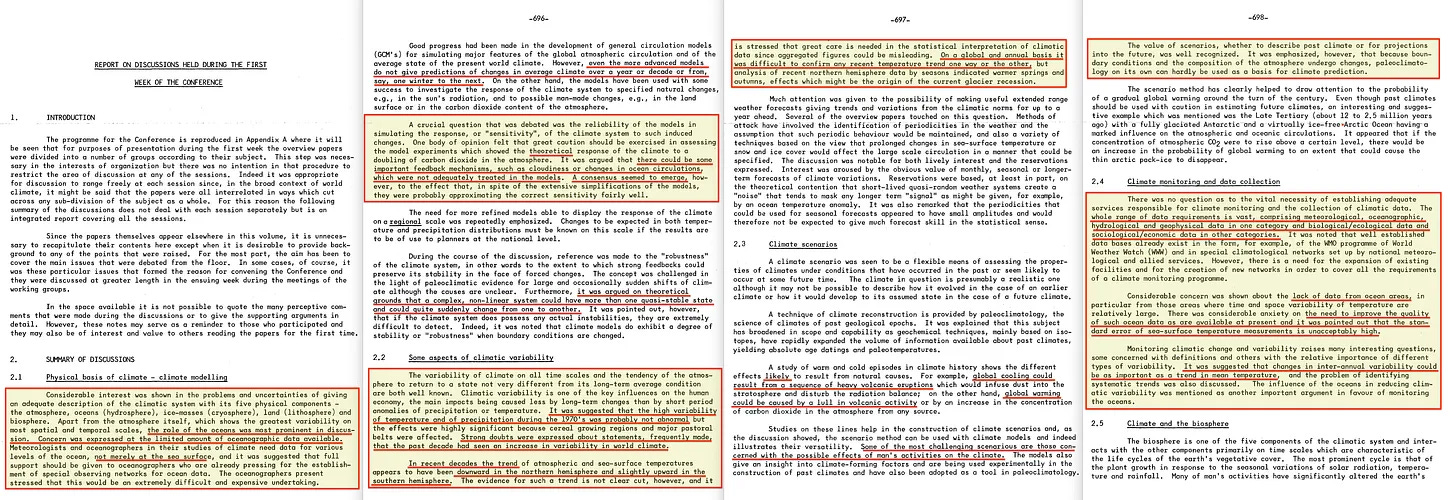Και αν αποφασίσετε να διαβάσετε τα πρακτικά της διάσκεψης του 1979, θα διαπιστώσετε ότι κάτι δεν πάει καλά. Διότι όχι μόνο ελάχιστα έγγραφα ασχολούνται με το πραγματικό θέμα που εξετάζεται, αλλά σχεδόν όλα ασχολούνται με το σχεδιασμό για το μέλλον της επικείμενης Βιβλικής Αποκάλυψης, και αυτό με εντυπωσιακό επίπεδο σύγχρονων λεπτομερειών και συνάφειας. Και δεδομένου ότι ο «κύριος υπεύθυνος» τους, ο Bert Bolin, λίγα χρόνια νωρίτερα είχε δηλώσει ενώπιον του Κογκρέσου των ΗΠΑ ότι δεν γνώριζαν σχεδόν τίποτα (εκτός από το ότι το διοξείδιο του άνθρακα είναι τροφή για τα φυτά), δεν υπάρχει καμία πιθανότητα η εν λόγω «επιστήμη» να είχε «οριστικοποιηθεί» μέχρι το 1979. Ούτε σε ένα δισεκατομμύριο χρόνια. Όχι μόνο δεν υπήρχε απολύτως καμία νόμιμη «συναίνεση» εκτός των κύκλων του ICSU που χρηματοδοτείται από το ίδρυμα όταν πραγματοποιήθηκε η διάσκεψη, αλλά οι εκθέσεις που δημοσιεύθηκαν πριν από την εκδήλωση αποκαλύπτουν ότι εσωτερικά αποδέχονταν ότι γνώριζαν ακόμη λιγότερα από όσα πίστευαν ότι γνώριζαν μια δεκαετία πριν. Ωστόσο, μόλις ολοκληρώθηκε η διάσκεψη, η νέα αφήγηση για τον άνθρακα τέθηκε σε εφαρμογή, σχεδόν αμέσως.