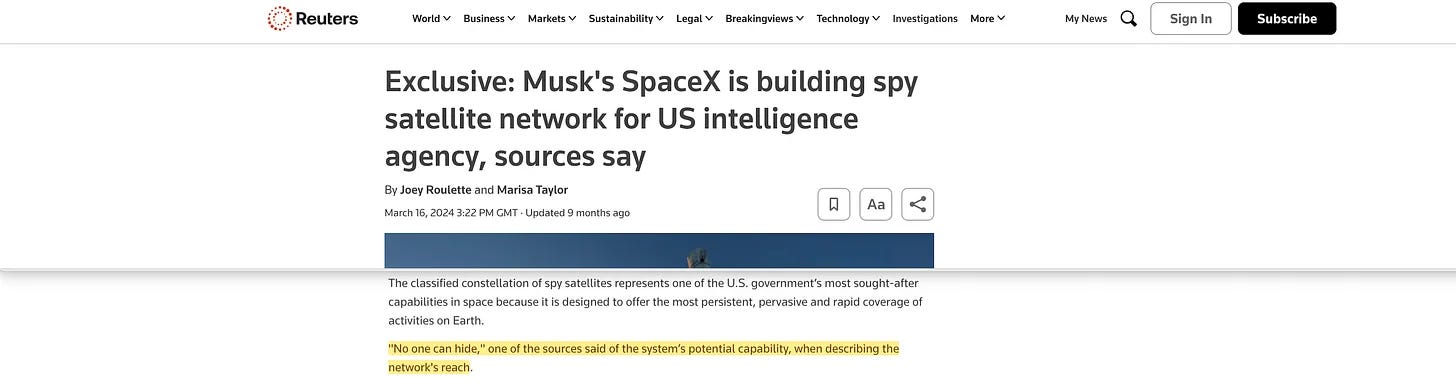 Και αυτό είναι ένα θέμα που καλύπτεται αρκετά σε αυτό το substack, επειδή αυτή η δορυφορική ικανότητα σίγουρα δημιουργήθηκε, ξεκινώντας με τα GOOS [4]/GCOS [5] /GTOS [6], που οδήγησαν στο GEOSS [7], στη συνέχεια στο GEO BON [8]/GBIOS [9], GEOHEALTH [10]/EO4HEALTH [11], ακόμη και CIT-SCI [12] που εστιάζει στη χρήση του κινητού σας τηλεφώνου και των κοινωνικών μέσων για να σας κατασκοπεύει, και τελικά κορυφώθηκε με τη Διακήρυξη της Canberra του 2019 [13], σχετικά με τη δορυφορική χωρητικότητα ζωντανής μετάδοσης, που επί του παρόντος δημιουργείται από... την SpaceX [14] του Elon Musk.