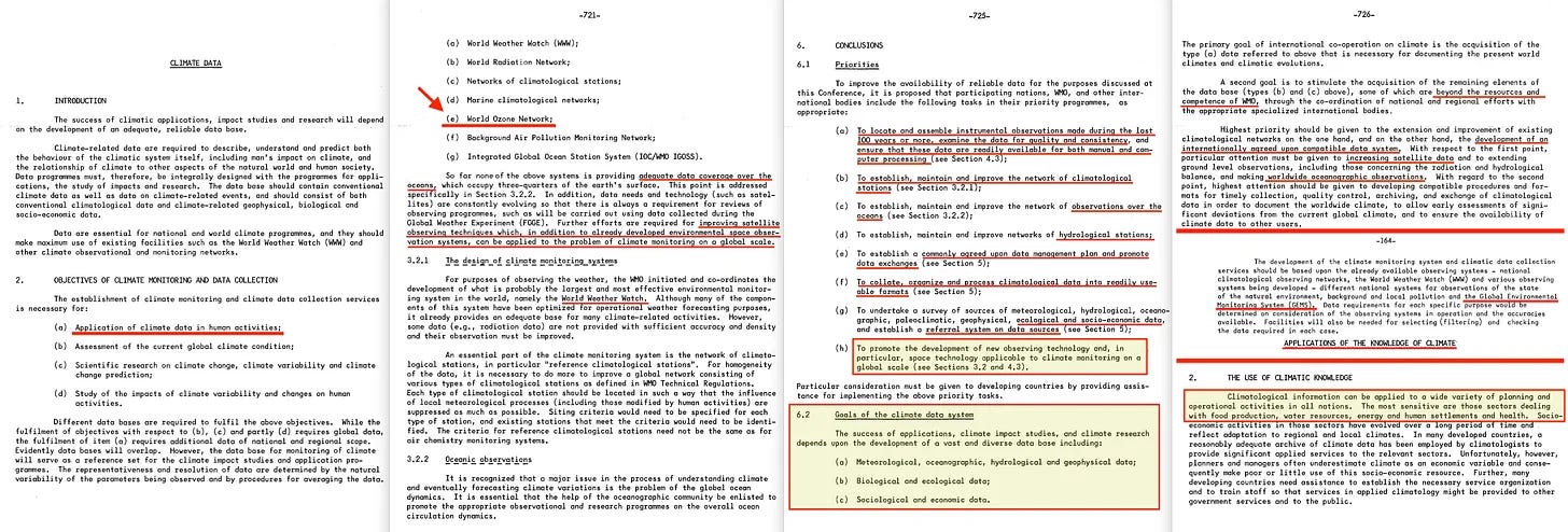 Και στην ενότητα «Κλιματικά δεδομένα», βλέπουμε μια έκκληση για την «εφαρμογή κλιματικών δεδομένων στις ανθρώπινες δραστηριότητες» (άσχετα από το γεγονός ότι τα εν λόγω δεδομένα είναι σχεδόν ανύπαρκτα), μια περαιτέρω έκκληση για δεδομένα υψηλότερης ανάλυσης σχετικά με τους ωκεανούς (η οποία οδήγησε στο Παγκόσμιο Σύστημα Παρατήρησης των Ωκεανών [3]), πριν ακόμη εκδοθεί ένα αίτημα για