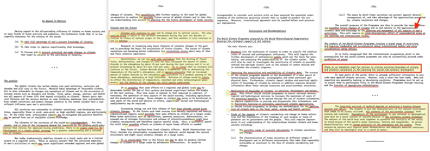 Η δήλωση με τίτλο «Έκκληση προς τα Έθνη» είναι γεμάτη με όρους όπως «μπορεί», «πιθανώς», «μπορεί», «ενδεχομένως» και «ίσως», περιγράφοντας έτσι πέρα από κάθε αμφιβολία - αλλά περιλαμβάνει επίσης γενικές δηλώσεις όπως «υπάρχει επείγουσα ανάγκη για την ανάπτυξη μιας κοινής παγκόσμιας στρατηγικής», για την οποία πρέπει να χρησιμοποιήσουμε αυτά... τεράστιες αβεβαιότητες για χάρη του «σχεδιασμού για τη μελλοντική ανάπτυξη της ανθρώπινης κοινωνίας», προτού τελικά παραδεχτούμε ότι «το κλίμα θα συνεχίσει να μεταβάλλεται... αργή τάση ψύξης σε τμήματα του βόρειου ημισφαιρίου... αν θα συνεχιστεί ή όχι είναι άγνωστο».