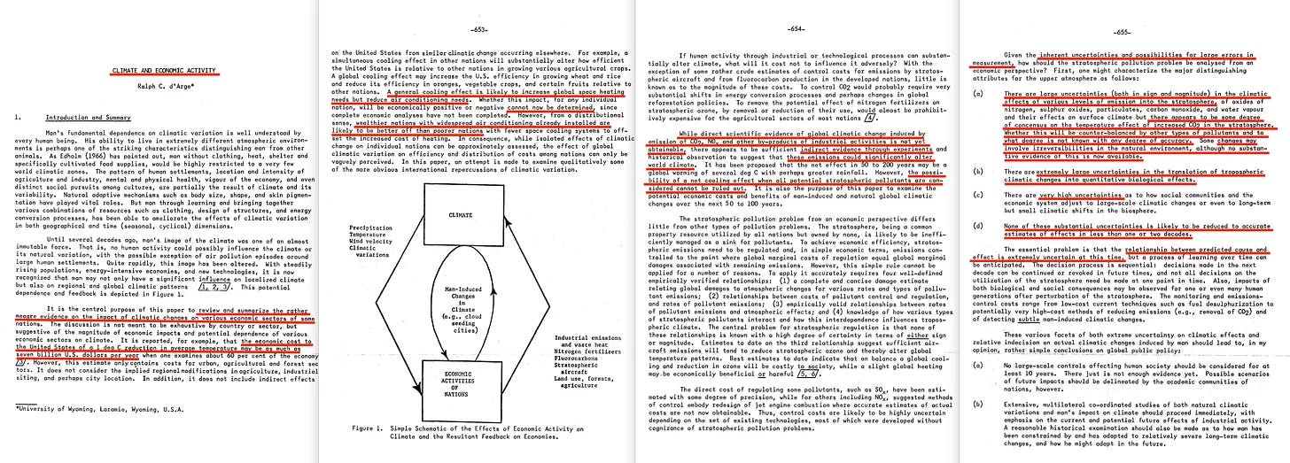 «Δεδομένων των εγγενών αβεβαιοτήτων και των πιθανών μεγάλων σφαλμάτων στις μετρήσεις... Υπάρχουν μεγάλες αβεβαιότητες (τόσο ως προς το πρόσημο όσο και ως προς το μέγεθος) όσον αφορά τις κλιματικές επιπτώσεις των διαφόρων επιπέδων εκπομπών στη στρατόσφαιρα... Δεν είναι γνωστό με ακρίβεια εάν αυτό θα αντισταθμιστεί από άλλους τύπους ρύπων και σε ποιο βαθμό... Υπάρχουν εξαιρετικά μεγάλες αβεβαιότητες όσον αφορά τη μετατροπή των κλιματικών αλλαγών της τροπόσφαιρας σε ποσοτικά βιολογικά αποτελέσματα... Υπάρχουν πολύ υψηλές αβεβαιότητες ως προς τον τρόπο προσαρμογής των κοινωνικών κοινοτήτων και του οικονομικού συστήματος... Καμία από αυτές τις ουσιαστικές αβεβαιότητες δεν είναι πιθανό να μειωθεί σε ακριβείς εκτιμήσεις των επιπτώσεων σε λιγότερο από μία ή δύο δεκαετίες... Το βασικό πρόβλημα είναι ότι η σχέση μεταξύ της προβλεπόμενης αιτίας και του αποτελέσματος είναι εξαιρετικά αβέβαιη αυτή τη στιγμή...»...