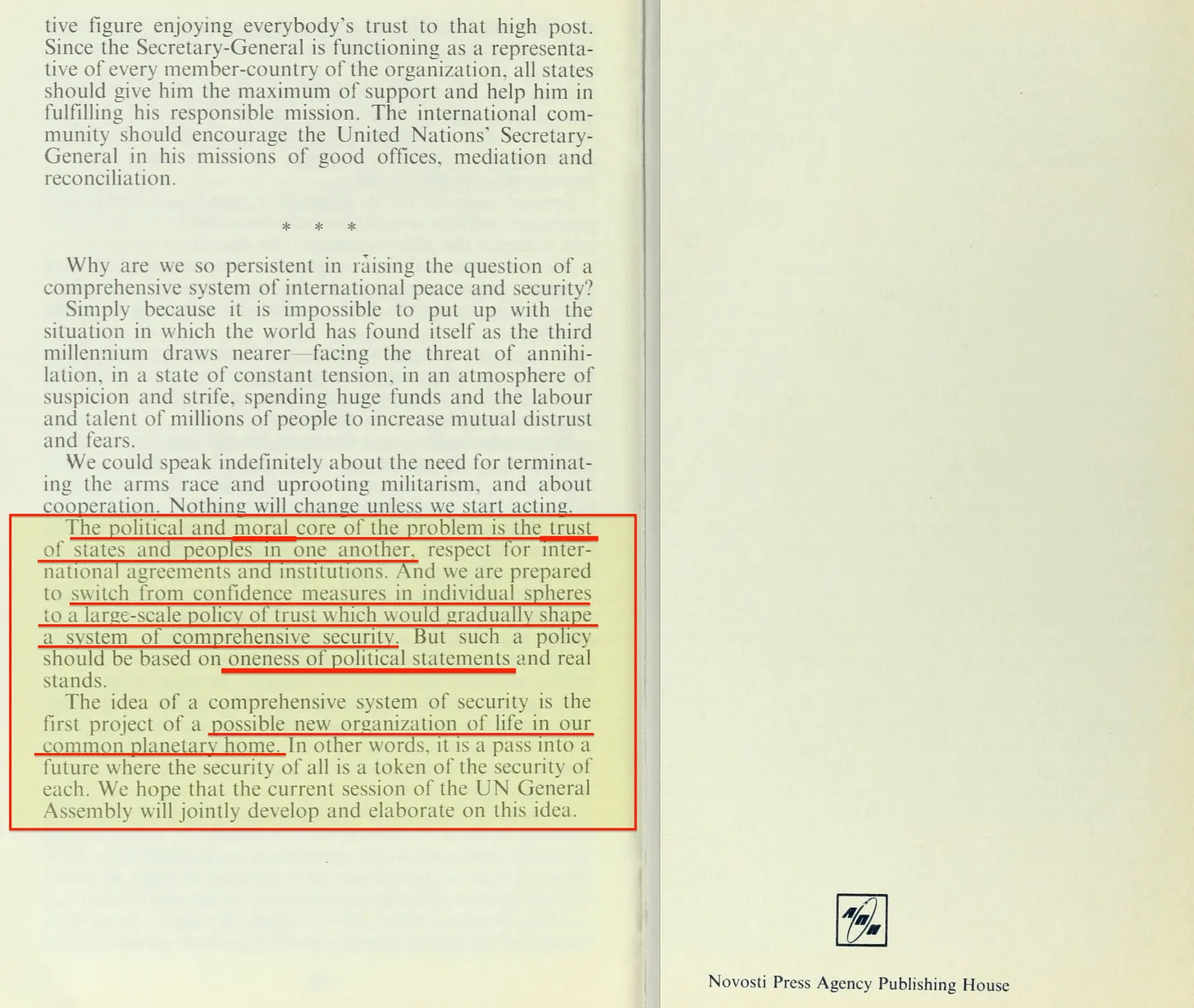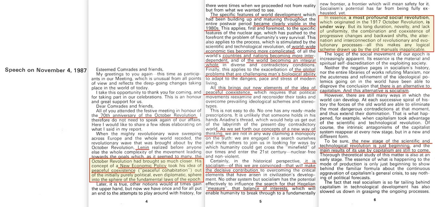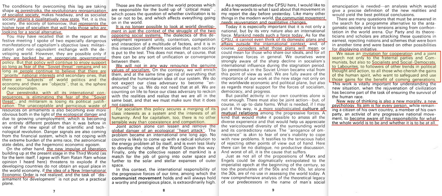 «Οι συνθήκες για την υπέρβαση αυτής της καθυστέρησης διαμορφώνονται καθώς η περεστρόικα, η επαναστατική αναδιοργάνωση της σοσιαλιστικής κοινωνίας. προχωράει και καθώς η σοσιαλιστική κοινωνία φτάνει σε μια ποιοτικά νέα κατάσταση. Ωστόσο, είναι αυτή η κοινωνία, η κοινωνία του αύριο, που αντιπροσωπεύει τον ανώτερο τύπο σοσιαλισμού που θα βοηθήσει εκείνους που αναζητούν μια κοινωνική εναλλακτική λύση».
