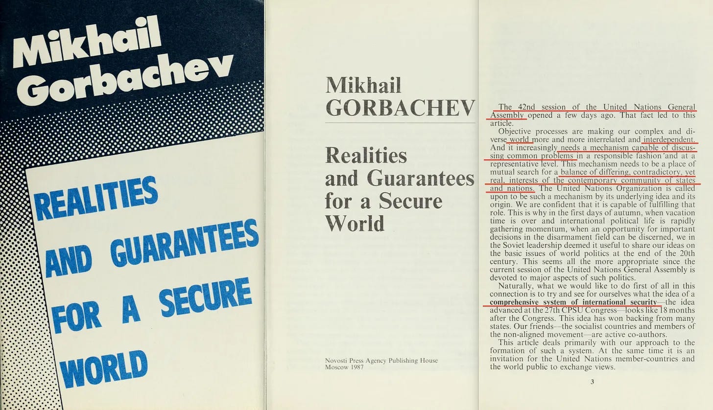Αλλά ας συνεχίσουμε με την παράσταση. Το πρώτο έγγραφο που θα επισκεφθούμε σήμερα είναι το «Πραγματικότητες και εγγυήσεις για έναν ασφαλή κόσμο» [1], που δεν είναι άλλο από τον ίδιο τον Mikhail Gorbachev. Και δεν είναι πραγματικά πολύ ενδιαφέρον για να ξεκινήσουμε.