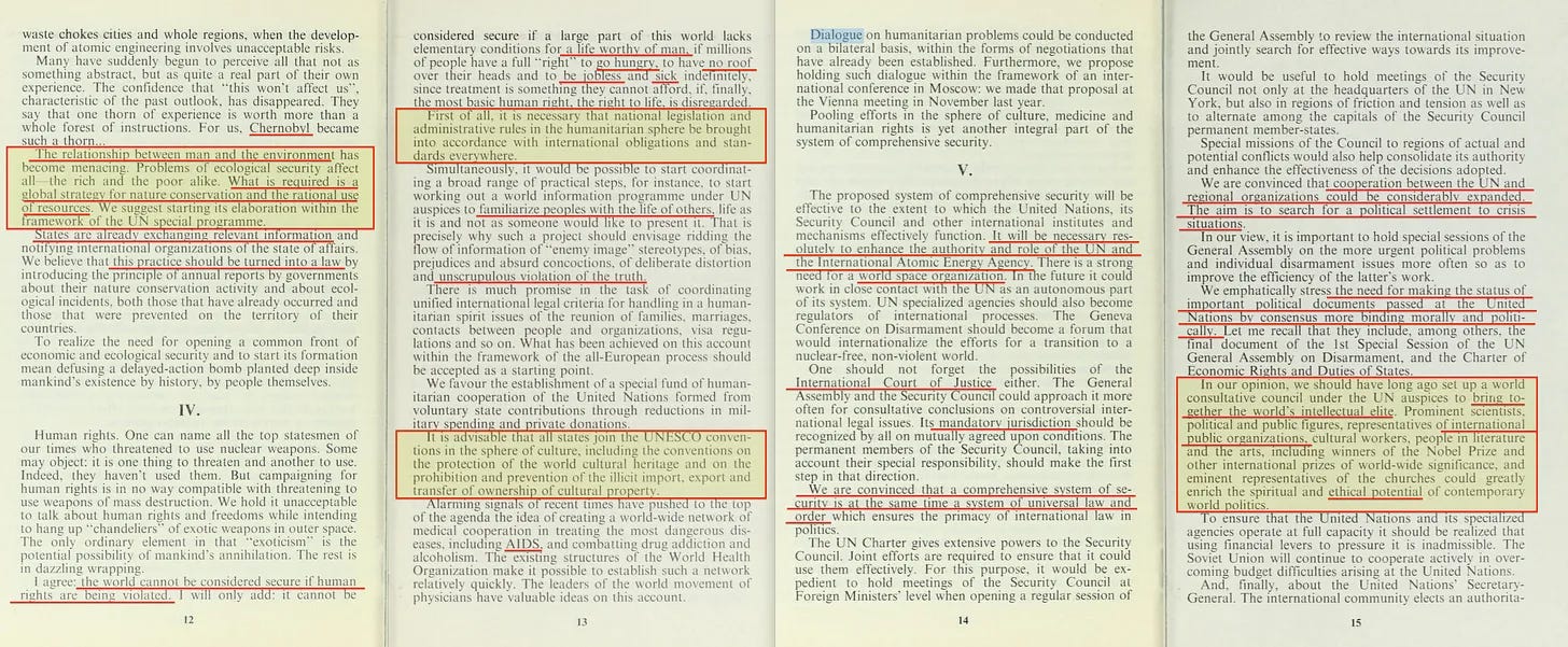 Τα Ηνωμένα Έθνη θα πρέπει να χρησιμεύσουν ως παγκόσμια βάση δεδομένων για την ανταλλαγή πληροφοριών με βάση το πλαίσιο, με τη διανομή των εν λόγω πληροφοριών να αποτελεί νομική απαίτηση. Στη συνέχεια, ο Gorbachev περνάει σε μια ενότητα για τα «ανθρώπινα δικαιώματα», τα οποία - και πάλι - οι κολεκτιβιστές ερμηνεύουν μέσα από μια πολύ διαφορετική οπτική γωνία -