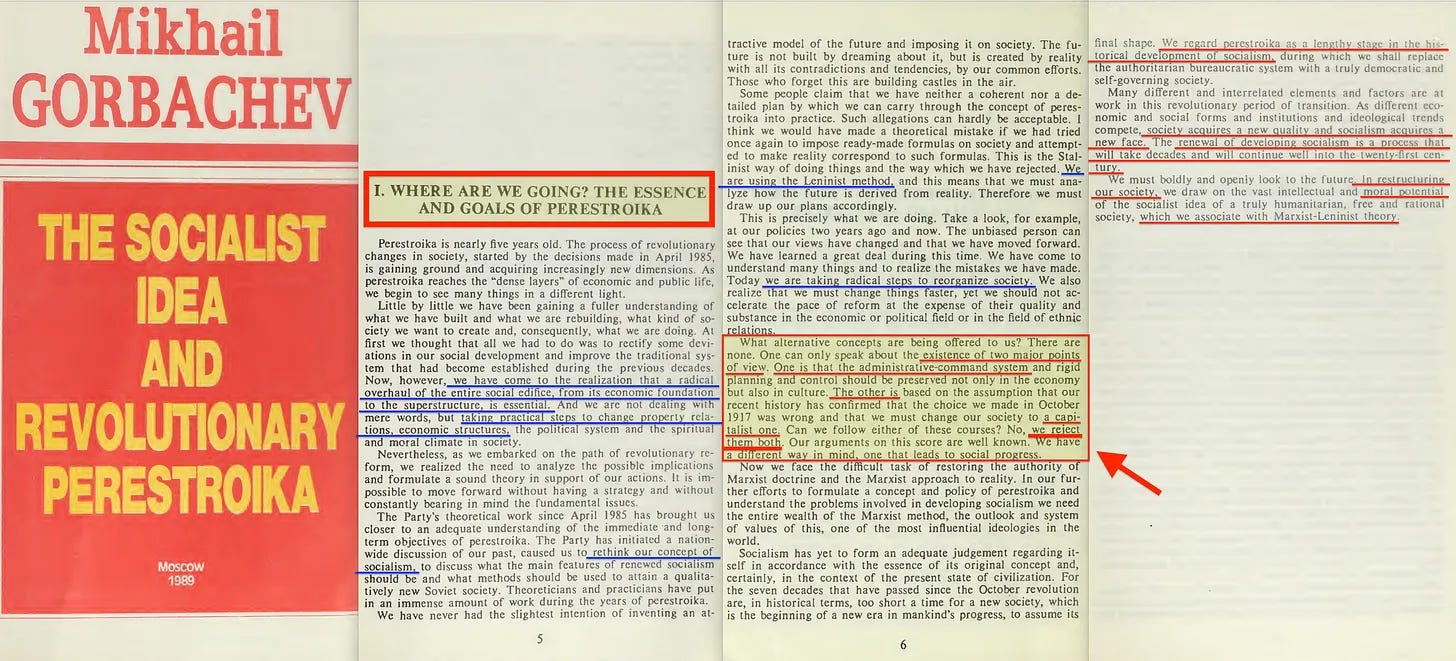 Το 1989, ο Gorbachev έγραψε επίσης το «Η σοσιαλιστική ιδέα και η επαναστατική περεστρόϊκα» [9] , το οποίο είναι λιγότερο φανερό στο πρώτο του κεφάλαιο, με τίτλο “Πού πάμε; Η ουσία και οι στόχοι της Περεστρόϊκα» -