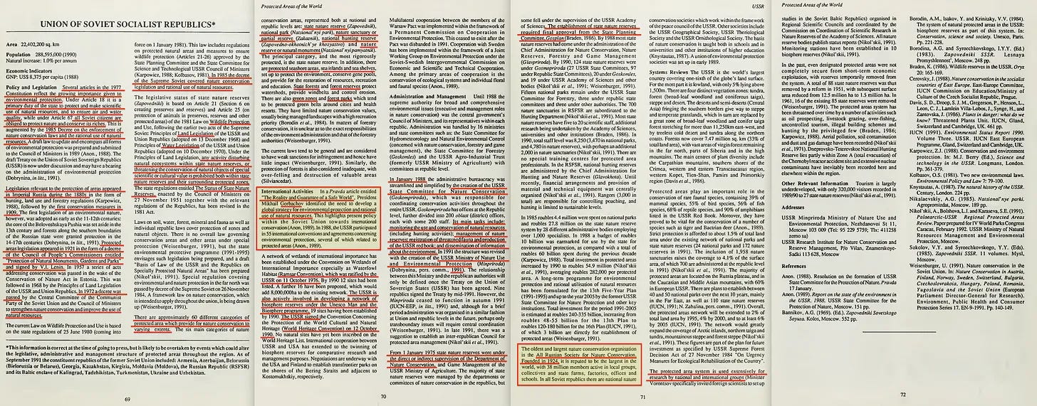 Η IUCN δημοσίευσε το 1991 μια ολοκληρωμένη ανασκόπηση της ΕΣΣΔ [7] , αποκαλύπτοντας μια εντυπωσιακή ιστορική ευθυγράμμιση με τις προσπάθειες διατήρησης της φύσης γενικά. Ειδικότερα, αναφέρεται στην All Russian Society for Nature Protection (VOOP), η οποία θα εξεταστεί περαιτέρω παρακάτω. Αλλά πρώτα, ας ασχοληθούμε με τον ίδιο τον Gorbachev.