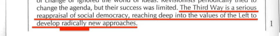 «Ο Τρίτος Δρόμος είναι μια σοβαρή επανεκτίμηση της σοσιαλδημοκρατίας, που φτάνει βαθιά στις αξίες της Αριστεράς για να αναπτύξει ριζικά νέες προσεγγίσεις» .