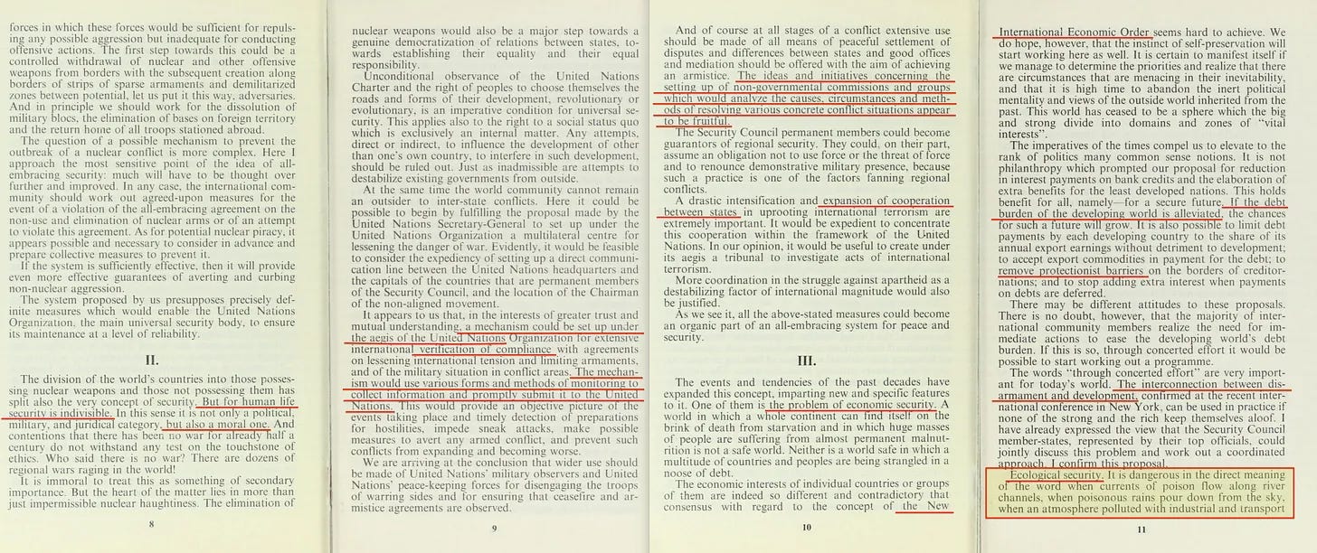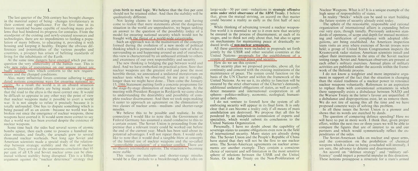 «Η περεστρόϊκα μας, με όλες τις διεθνείς συνέπειές της, εξαλείφει το φόβο της “σοβιετικής απειλής” και ο μιλιταρισμός χάνει την πολιτική του δικαίωση...»