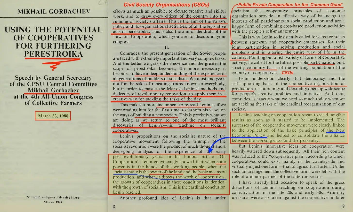 Το 1988, ο Gorbachev κυκλοφόρησε το φυλλάδιο «Using the Potential of Cooperatives for Furthering Perestroika» (Αξιοποίηση του δυναμικού των συνεταιρισμών για την προώθηση της περεστρόϊκα) [8]. Οι συνεταιρισμοί, με τη λενινιστική έννοια, αναπτύχθηκαν στην προηγούμενη ανάρτηση για τη Νέα Οικονομική Πολιτική, αλλά εν ολίγοις - μαζί με την ίδια τη Νέα Οικονομική Πολιτική - αυτοί οι συνεταιρισμοί ήταν ουσιαστικά δομημένοι έτσι ώστε να διασφαλίζουν ότι το Κομμουνιστικό Κόμμα διατηρούσε την τελική εξουσία να τερματίσει το καταστατικό τους. Περιμένετε, αυτό ακούγεται εξαιρετικά παρόμοιο με την έκφραση που χρησιμοποίησε ο Blair το 1991, αλλά η πρόθεση παραμένει η ίδια.