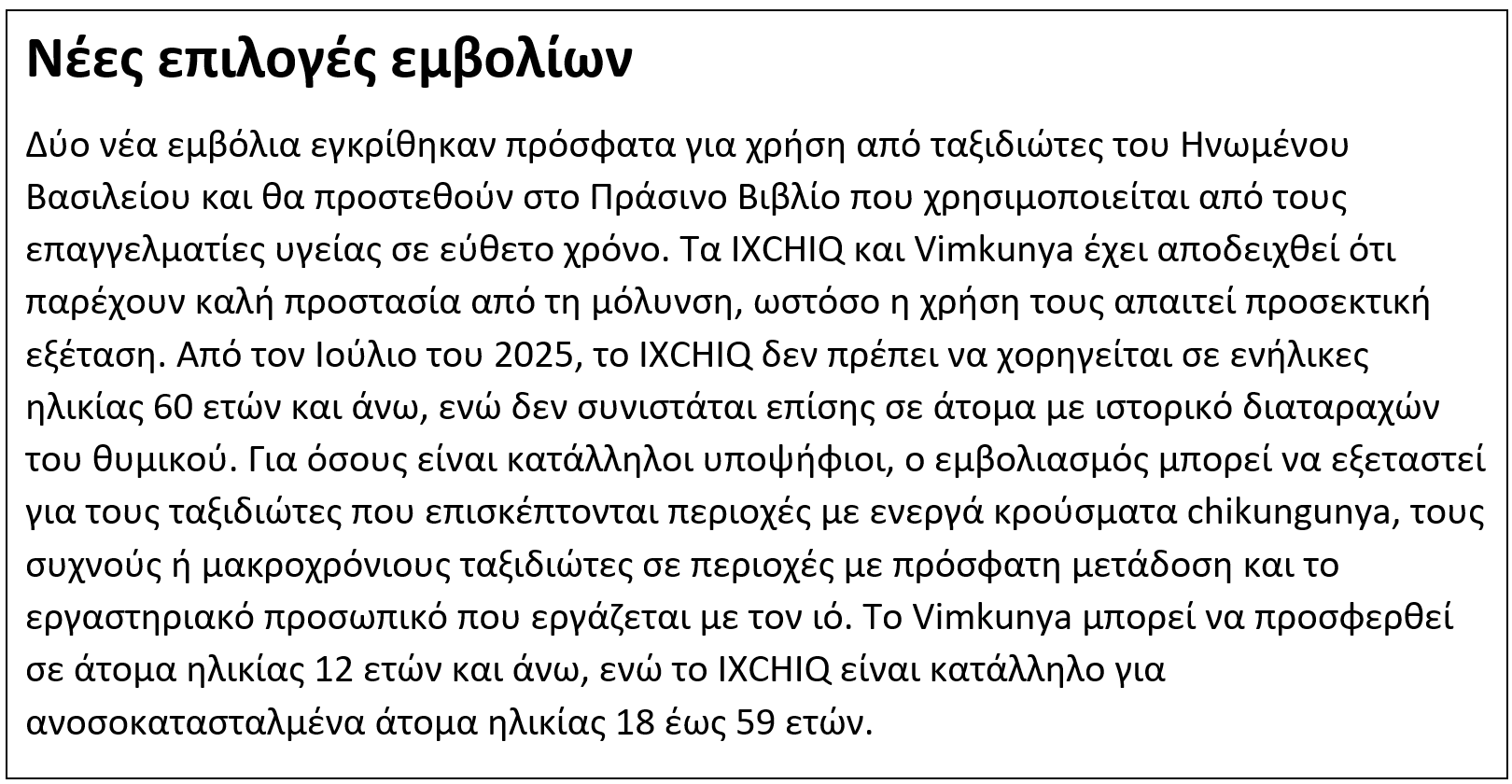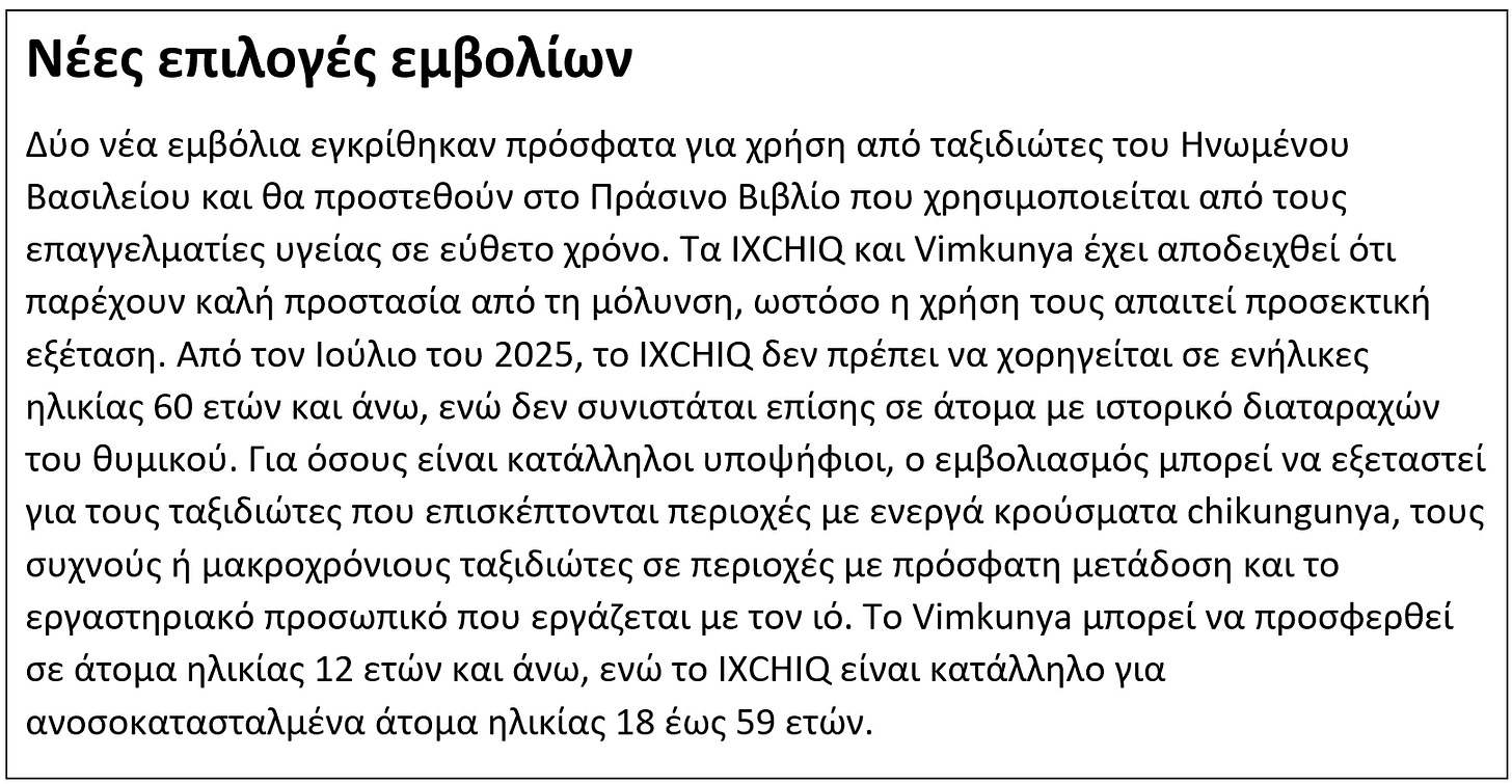 «Ένα εμβόλιο για την chikungunya μπορεί επίσης να εξεταστεί για όσους ταξιδεύουν σε περιοχές με υψηλότερο κίνδυνο».