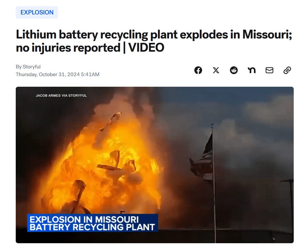 Στις 27 Οκτωβρίου 2024, ένα εργοστάσιο ανακύκλωσης μπαταριών λιθίου στο Fredericktown του Missouri, ξέσπασε στις φλόγες, στέλνοντας καπνό να υψώνεται σε όλη την πόλη. Οι πρώτες αναφορές από το ABC7 Chicago ανέφεραν ότι, ευτυχώς, κανένας εργαζόμενος δεν τραυματίστηκε σοβαρά. Ωστόσο, ο πυκνός καπνός ανάγκασε την εκκένωση γειτονικών περιοχών και προκάλεσε μεγάλες ανησυχίες σχετικά με τους ρύπους που εκλύονται από τέτοιες πυρκαγιές.
