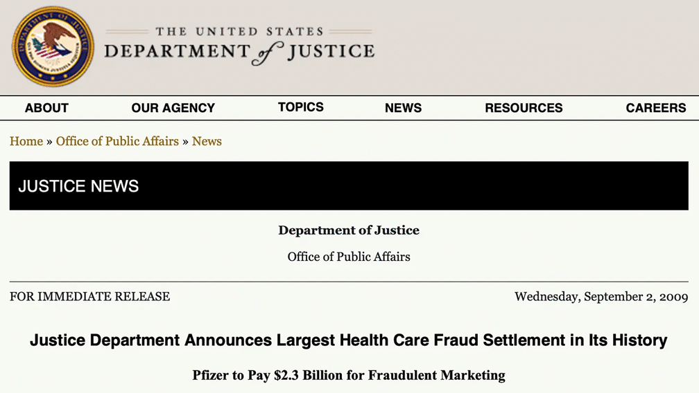 Έχει σημασία, ενημέρωσαν οι υγειονομικές αρχές των ΗΠΑ το κοινό ότι η Pfizer έχει ποινικό μητρώο με το Υπουργείο Δικαιοσύνης των ΗΠΑ (2009); Είναι η μόνη μεγάλη φαρμακευτική εταιρεία που έχει ποινικό μητρώο στις ΗΠΑ.