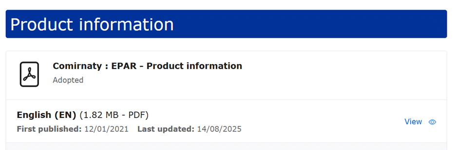 Οι πληροφορίες προϊόντος της Comirnaty περιλαμβάνουν πράγματι την επικαιροποιημένη προειδοποίηση - για τους κατοίκους των ΗΠΑ. Δεν φαίνεται να συμβαίνει αυτό παντού αλλού.