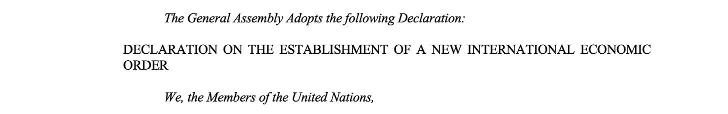 ... η λειτουργία του συστήματος των Ηνωμένων Εθνών και η εγκαθίδρυση ενός νέου συστήματος παγκόσμιων οικονομικών σχέσεων που θα βασίζεται στην ισότητα και το κοινό συμφέρον όλων των χωρών”.