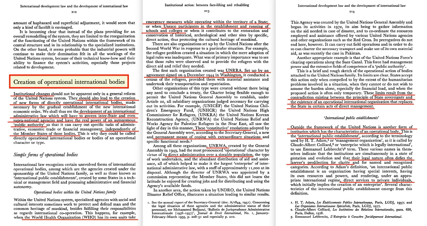 Ωστόσο, εκτός του επίσημου πλαισίου των Ηνωμένων Εθνών, εισάγεται ένας νέος τύπος οργανισμού, τον οποίο ακόμη και οι δικηγόροι δυσκολεύονται να ορίσουν με σαφήνεια: ο διεθνής δημόσιος οργανισμός. Το μοντέλο αυτό λειτουργεί διαφορετικά. Παρέχει υπηρεσίες απευθείας στους πολίτες, παρακάμπτοντας ουσιαστικά την κρατική εξουσία.