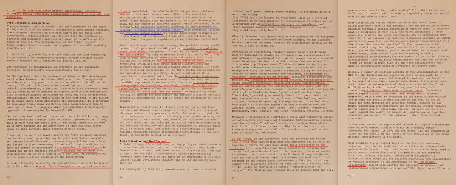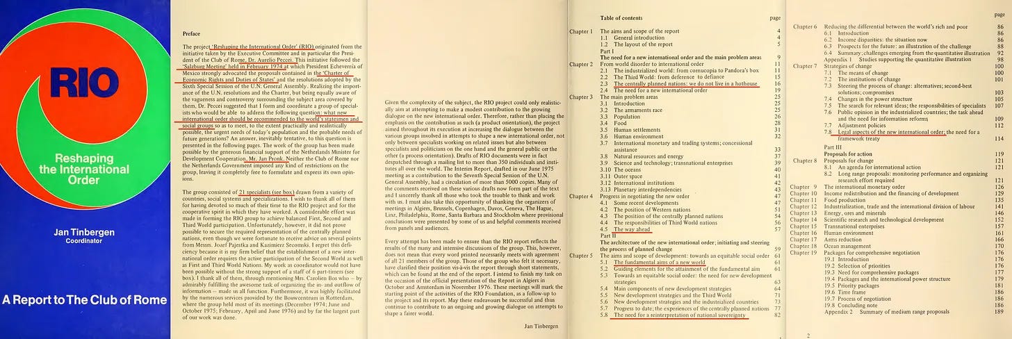 Όσον αφορά το πρώτο από τα δύο έγγραφα, εδώ είναι το Reshaping the International Order [4] , το οποίο δημοσιεύθηκε από τη Λέσχη της Ρώμης το 1976, ενώ οι σχετικές διασκέψεις ξεκίνησαν το 1974.
