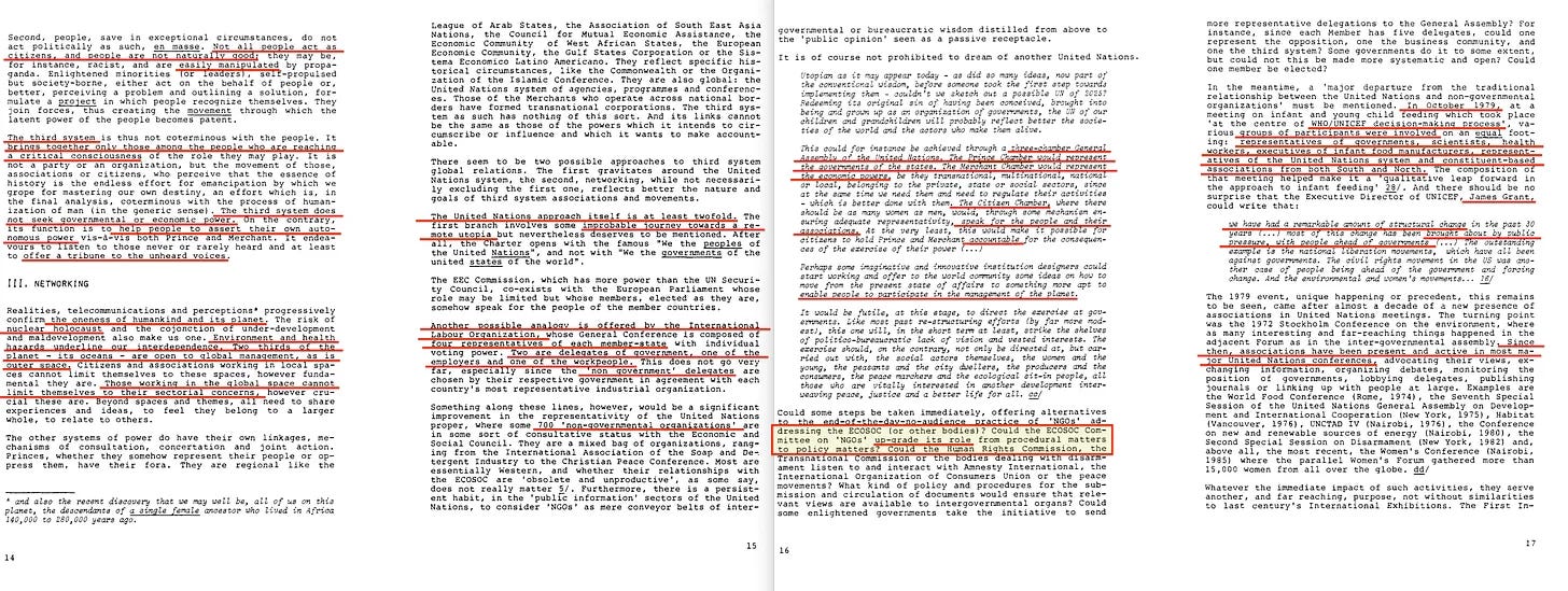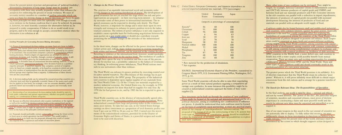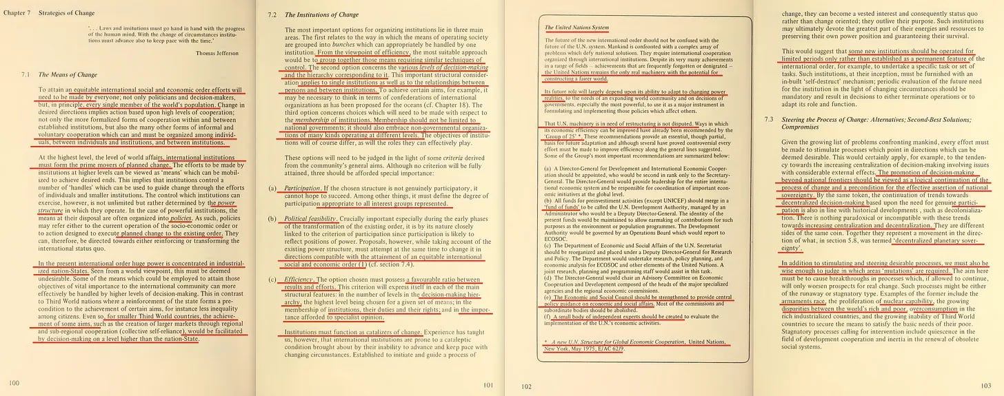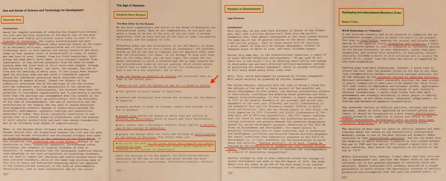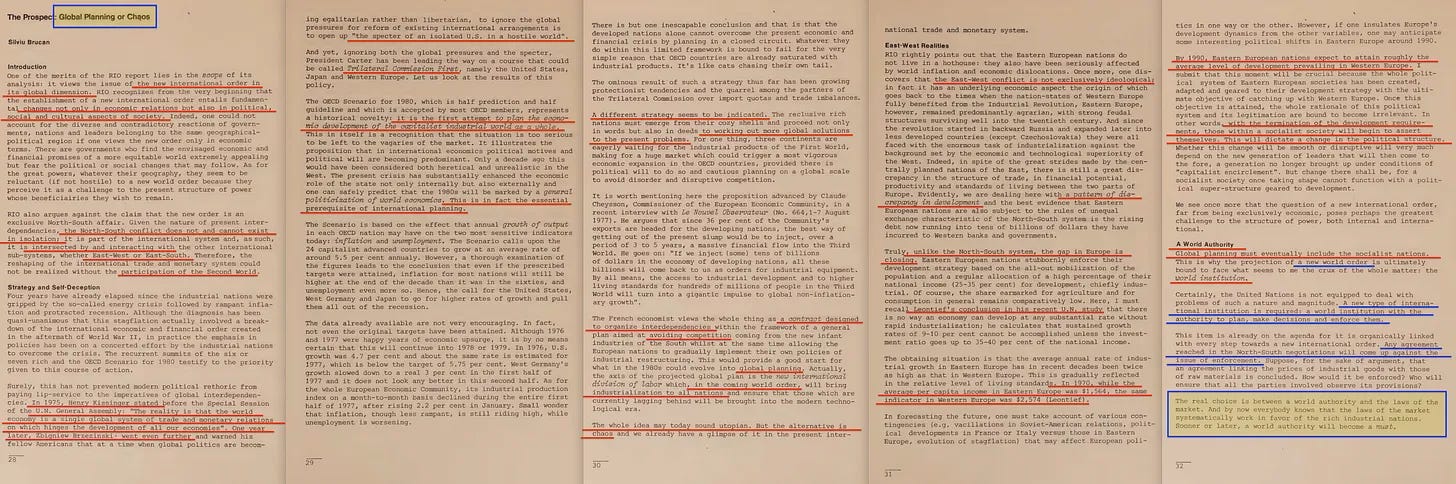 Η έκθεση περιλαμβάνει επίσης ένα πρώιμο διαμάντι με τίτλο «Παγκόσμιος Σχεδιασμός ή Χάος», το οποίο ευγενικά μας υπενθυμίζει ότι η πρόκληση δεν είναι μόνο ένα χάσμα Βορρά-Νότου, αλλά και Ανατολής-Δύσης. Και, φυσικά, η Ανατολή πρέπει να συμπεριληφθεί στο ένδοξο μέλλον του παγκόσμιου σχεδιασμού μας. Σε αυτό το πλαίσιο, η Τριμερής Επιτροπή [14] είναι επίσης αξιοσημείωτη - εξάλλου, τίποτα δεν ενσαρκώνει την «αντιπροσωπευτική διακυβέρνηση» καλύτερα από όσο μια συγκέντρωση κεκλεισμένων των θυρών από μη-εκλεγμένους μεσίτες εξουσίας που αποφασίζουν για το μέλλον του πλανήτη».