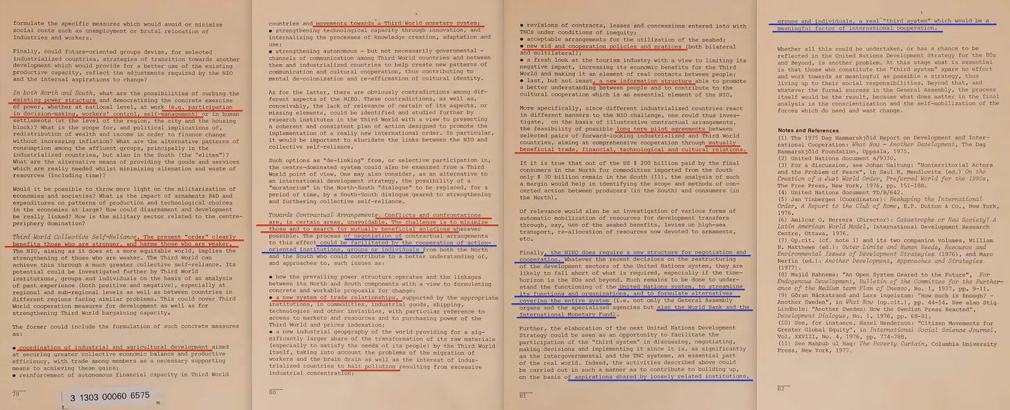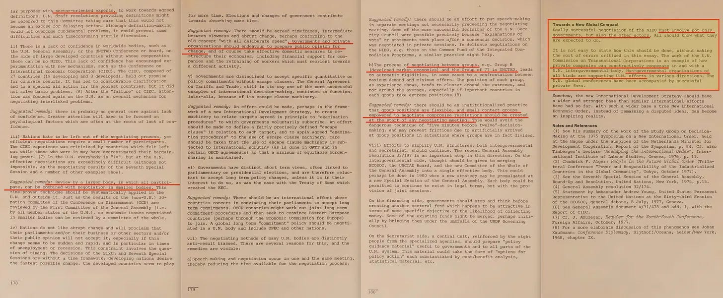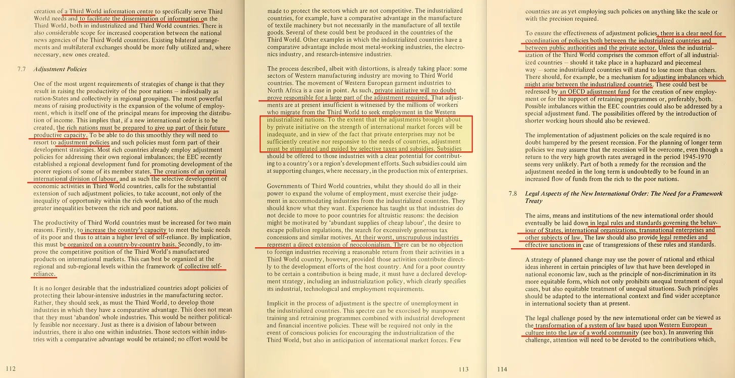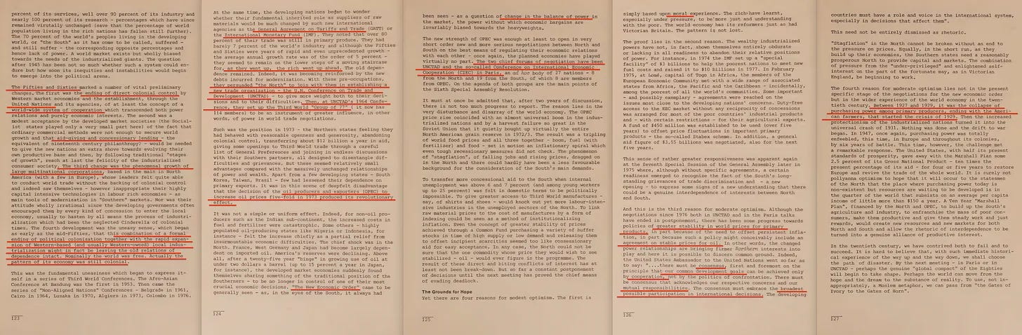 Η έκθεση περιλαμβάνει επίσης ένα πρώιμο διαμάντι με τίτλο «Παγκόσμιος Σχεδιασμός ή Χάος», το οποίο ευγενικά μας υπενθυμίζει ότι η πρόκληση δεν είναι μόνο ένα χάσμα Βορρά-Νότου, αλλά και Ανατολής-Δύσης. Και, φυσικά, η Ανατολή πρέπει να συμπεριληφθεί στο ένδοξο μέλλον του παγκόσμιου σχεδιασμού μας. Σε αυτό το πλαίσιο, η Τριμερής Επιτροπή [14] είναι επίσης αξιοσημείωτη - εξάλλου, τίποτα δεν ενσαρκώνει την «αντιπροσωπευτική διακυβέρνηση» καλύτερα από όσο μια συγκέντρωση κεκλεισμένων των θυρών από μη-εκλεγμένους μεσίτες εξουσίας που αποφασίζουν για το μέλλον του πλανήτη».