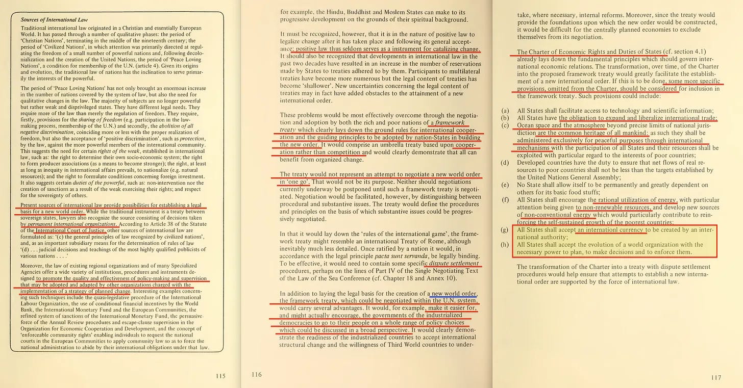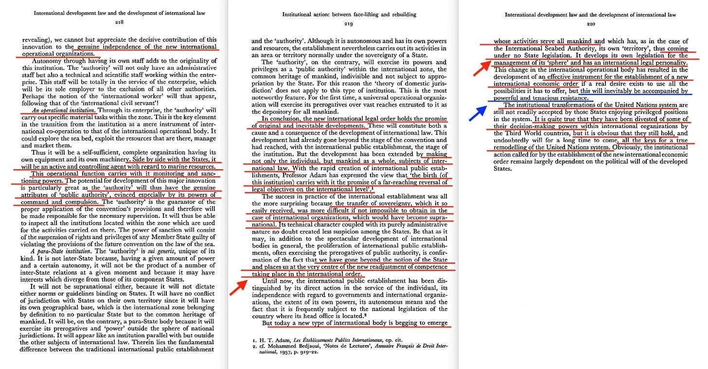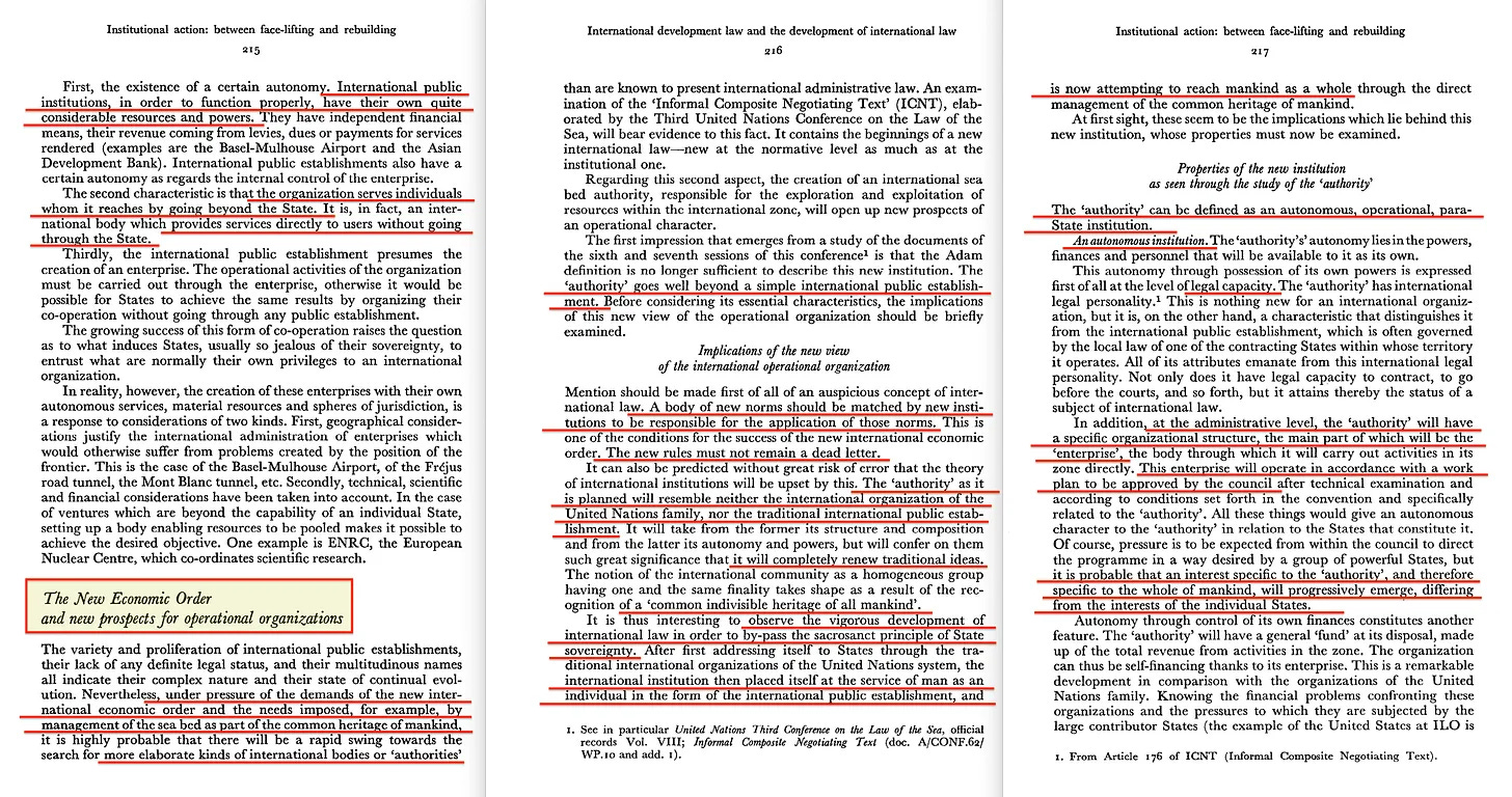 Σήμερα όμως παρακαλεί να αναδυθεί ένας νέος τύπος διεθνούς οργανισμού, του οποίου οι δραστηριότητες εξυπηρετούν όλη την ανθρωπότητα και ο οποίος έχει, όπως στην περίπτωση της Διεθνούς Αρχής για τον Βυθό, τη δική του «επικράτεια», άρα δεν υπόκειται σε καμία κρατική νομοθεσία. Αναπτύσσει τη δική του νομοθεσία για τη διαχείριση της «σφαίρας» του και έχει διεθνή νομική προσωπικότητα. Αυτή η αλλαγή του διεθνούς επιχειρησιακού οργάνου είχε ως αποτέλεσμα την ανάπτυξη ενός αποτελεσματικού μέσου για την εγκαθίδρυση μιας νέας διεθνούς οικονομικής τάξης, εφόσον υπάρχει πραγματική επιθυμία να αξιοποιηθούν όλες οι δυνατότητες που προσφέρει, αλλά αυτό θα συνοδευτεί αναπόφευκτα από ισχυρή και επίμονη αντίσταση.