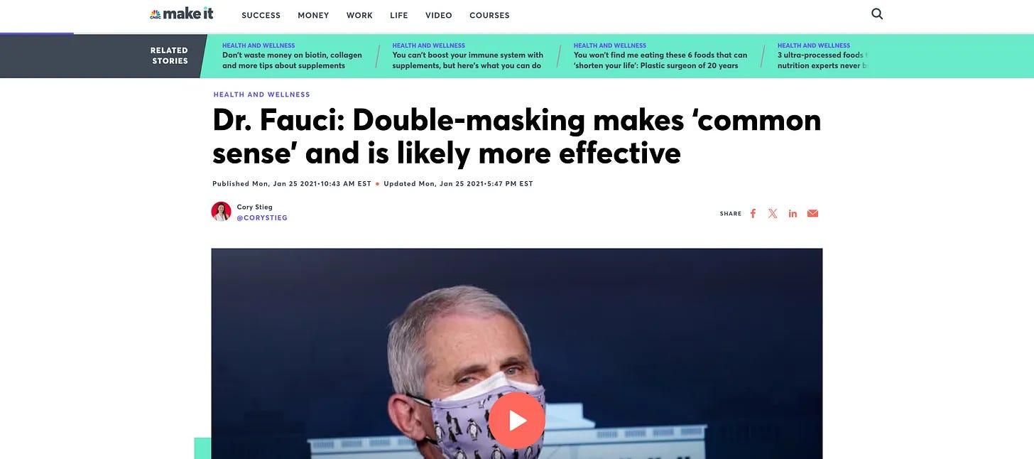 8 https://www.cnbc.com/2021/01/25/dr-fauci-double-mask-during-covid-makes-common-sense-more-effective.html
