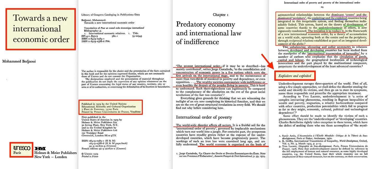 Το βιβλίο: Towards a New International Economic Order «Προς μια νέα διεθνή οικονομική τάξη» του Mohammed Bedjaoui, που εκδόθηκε από την UNESCO το 1979, δεν χάνει χρόνο και θέτει αμέσως το πλαίσιο: εκμεταλλευτής έναντι εκμεταλλευόμενου [1].