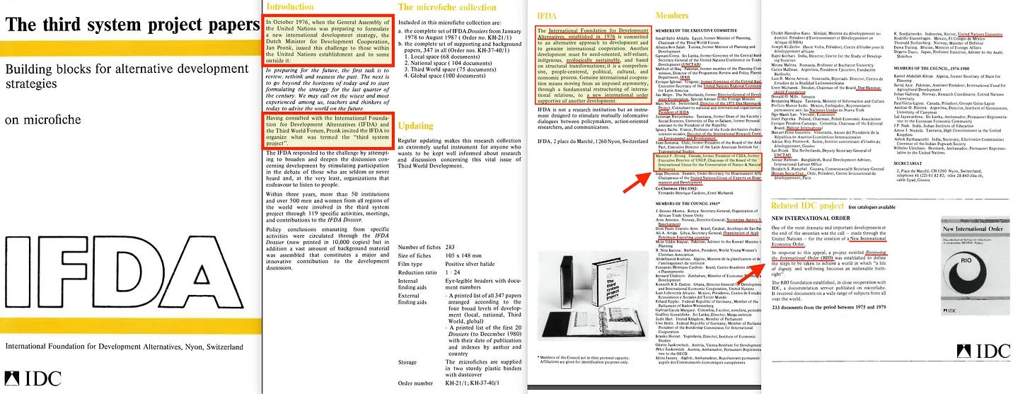Αλλά πρώτα -για όσους δεν είναι εξοικειωμένοι με τον IFDA, ας πούμε ότι ήταν μια οργάνωση αφιερωμένη στην «εναλλακτική ανάπτυξη» του σαφώς προοδευτικού είδους, με τον Maurice Strong στο ρόστερ [17].