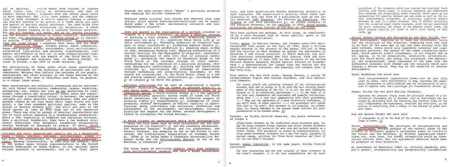 Και αυτό που είναι εκπληκτικό -αλλά δυστυχώς προβλέψιμο- είναι ότι ο Marc Nerfin ξοδεύει τις επόμενες τέσσερις σελίδες για να περιγράψει όλα όσα δεν είναι το σύστημα. Προφανώς, αυτό συμβαίνει επειδή δεν έχει καμία πρόθεση να διερευνήσει τις λεπτότερες λεπτομέρειες της ρύθμισης δημόσιου-ιδιωτικού-CSO***. Αντ’ αυτού, σπαταλά σελίδα με σελίδα θρηνώντας για τα τρομερά -απλά τρομερά- αποτελέσματα μεταξύ καταπιεστών και καταπιεσμένων που προκύπτουν από τις παραμένουσες αποικιοκρατικές δομές εξουσίας του σήμερα. Αυτές, επιμένει, πρέπει να μεταρρυθμιστούν επειγόντως, ώστε οι ΜΚΟ να αρχίσουν να διαχειρίζονται τις παγκόσμιες υποθέσεις - δημιουργώντας έτσι ένα σύστημα ικανό να επιτρέψει χειρότερες καταχρήσεις από οτιδήποτε άλλο πέτυχε ποτέ η αποικιοκρατία.