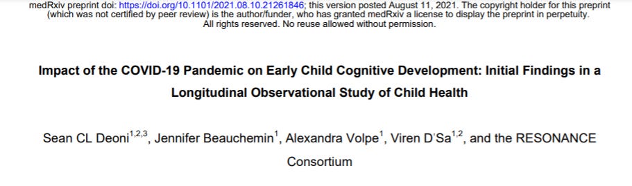 Ο Dr. Mark McDonald, κλινικός ψυχίατρος για παιδιά και εφήβους, αναφέρθηκε στη μελέτη του Brown σε πρόσφατη συνέντευξή του στη Cindy Drukier του "The Nation Speaks". Η μελέτη διαπίστωσε ότι: "τα παιδιά που γεννήθηκαν κατά τη διάρκεια της πανδημίας έχουν σημαντικά μειωμένες λεκτικές, κινητικές και συνολικές γνωστικές επιδόσεις σε σύγκριση με τα παιδιά που γεννήθηκαν πριν από την πανδημία".
