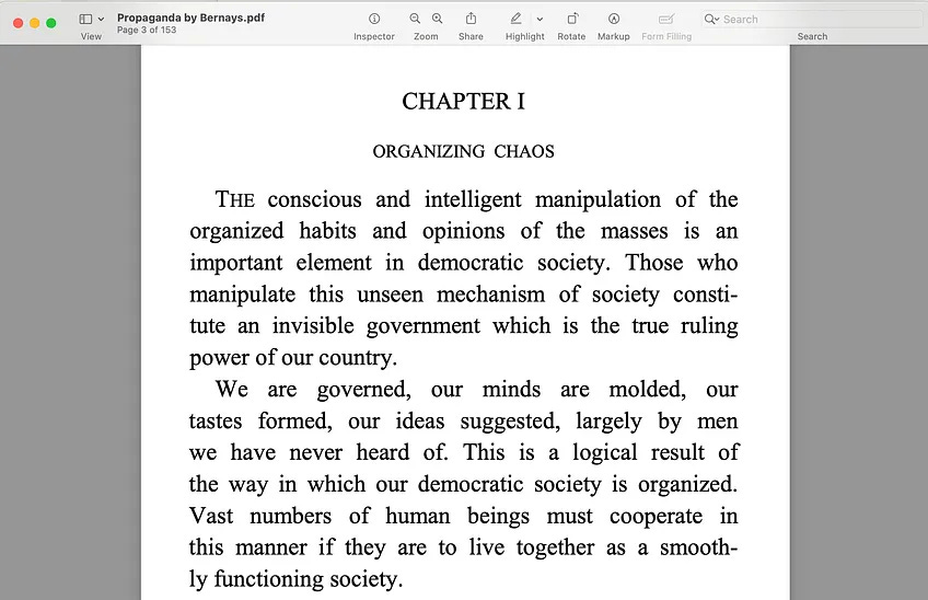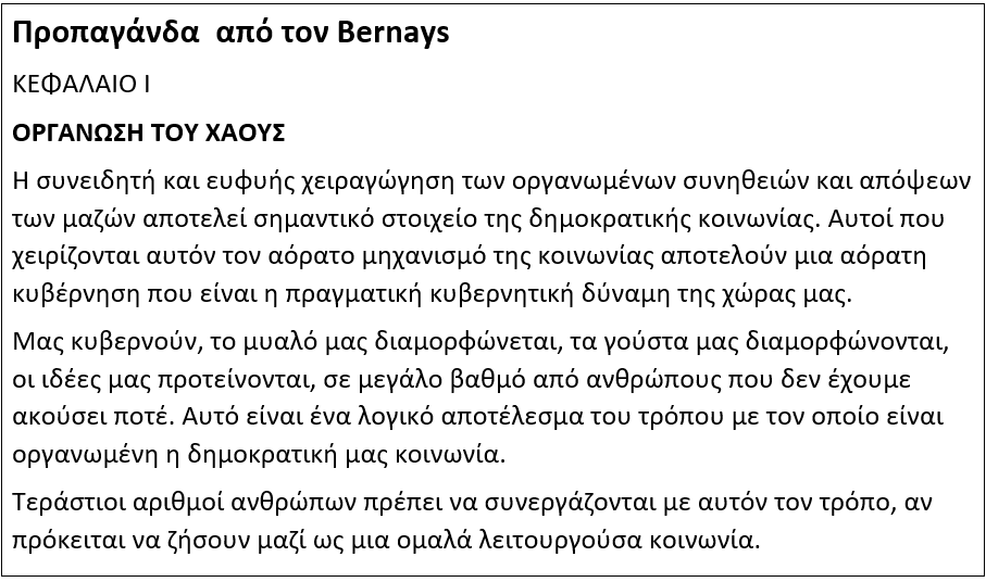 Οι "επίδοξοι ελεγκτές" γνωρίζουν πολύ καλά την ανθρώπινη ψυχολογία και τη δύναμη του νου και έτσι οι "ειδήσεις" αποσκοπούν στο να μας ενθαρρύνουν να ανταποκριθούμε και να αντιδράσουμε με ορισμένους τρόπους. Αν δεν είστε εξοικειωμένοι με το βιβλίο: Propaganda του Edward Bernays, εδώ είναι ένα απόσπασμα από το πρώτο κεφάλαιο: