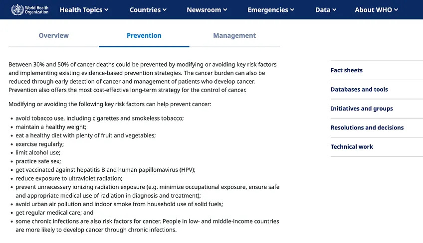"Πάνω από 35 εκατομμύρια νέα περιστατικά καρκίνου προβλέπονται για το 2050, μια αύξηση 77% από τα 20 εκατομμύρια περιστατικά που εκτιμάται ότι θα εμφανιστούν το 2022. Η ταχέως αυξανόμενη παγκόσμια επιβάρυνση από τον καρκίνο αντανακλά τόσο τη γήρανση και την αύξηση του πληθυσμού, όσο και τις αλλαγές στην έκθεση των ανθρώπων σε παράγοντες κινδύνου, αρκετοί από τους οποίους συνδέονται με την κοινωνικοοικονομική ανάπτυξη. Ο καπνός, το αλκοόλ και η παχυσαρκία αποτελούν βασικούς παράγοντες πίσω από την αύξηση της επίπτωσης του καρκίνου, ενώ η ατμοσφαιρική ρύπανση εξακολουθεί να αποτελεί βασικό παράγοντα περιβαλλοντικών παραγόντων κινδύνου".