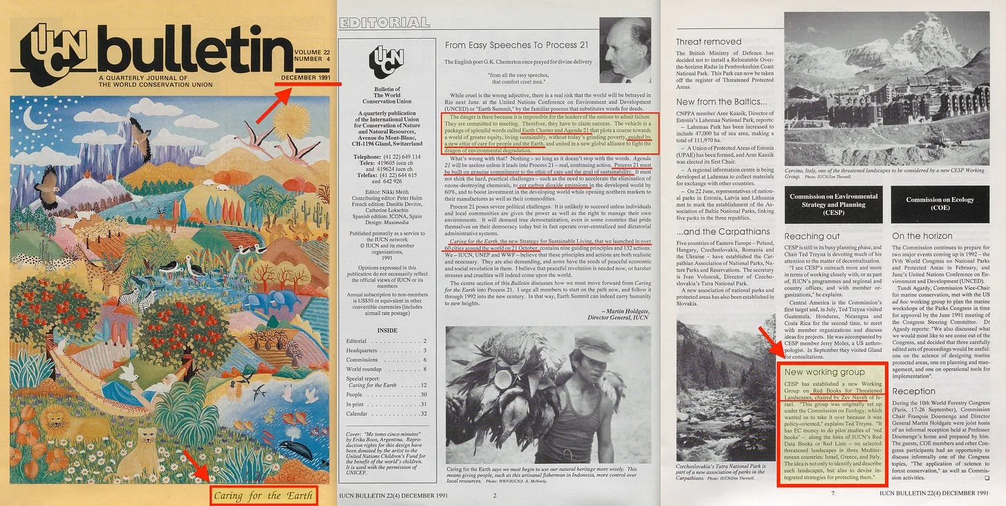 Και μπορούμε να συνδέσουμε ακόμη και άλλες πρωτοβουλίες. Δηλαδή, το Δελτίο της IUCN του 1991 που ανακοινώνει το «Caring for the Earth» [12] , μετά από μια προβλέψιμη εισαγωγή από τον Martin Holdgate -