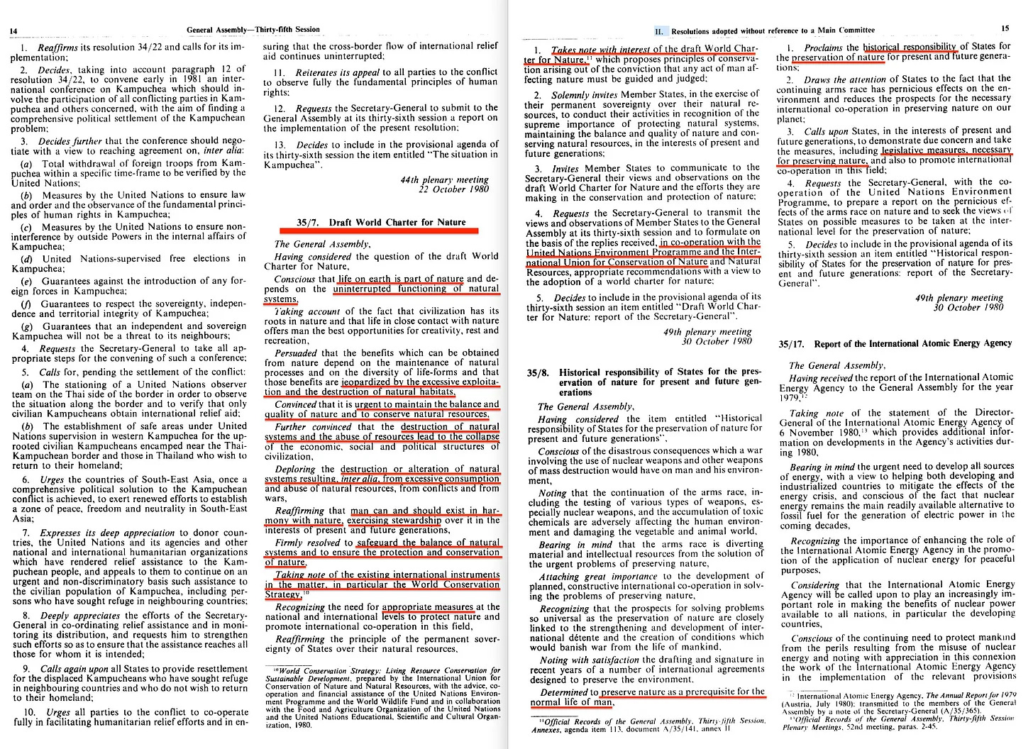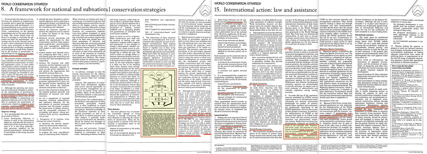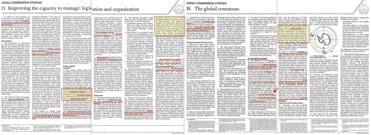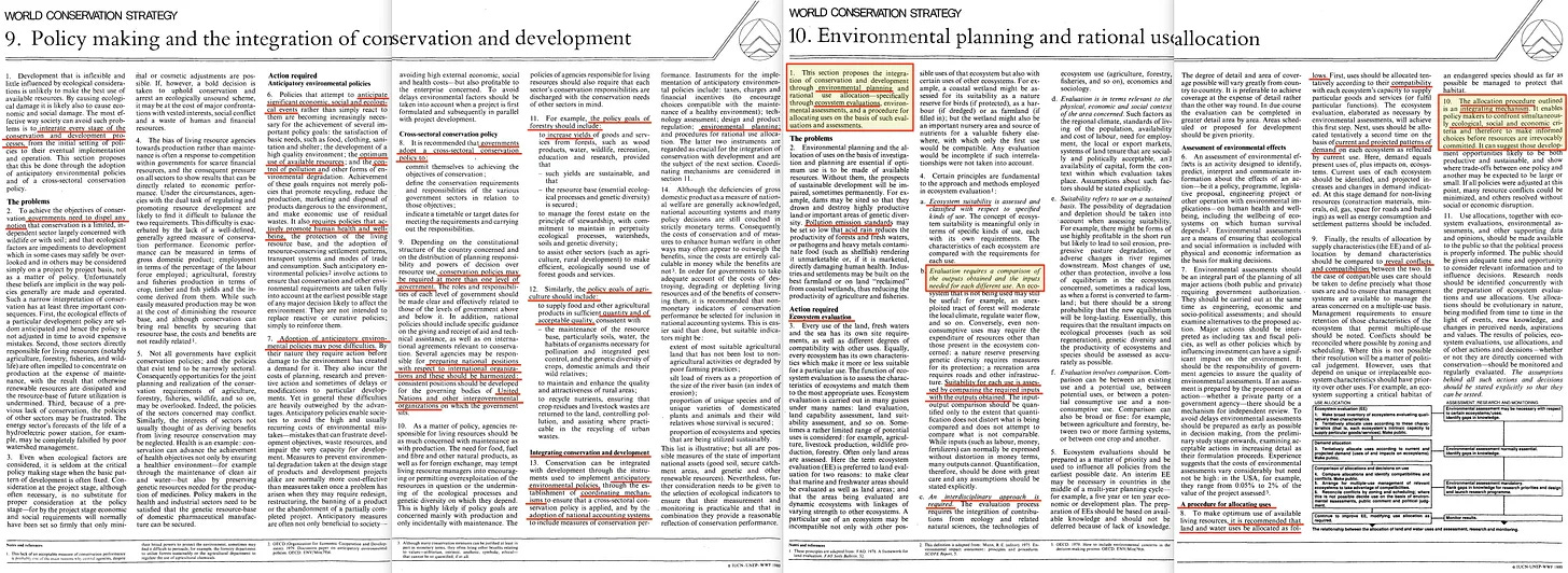 Πρόκειται για μια εξαιρετικά ταχεία ανασκόπηση, πιθανότατα, ενός από τα σημαντικότερα έγγραφα στην ιστορία της διατήρησης του περιβάλλοντος και της βιώσιμης ανάπτυξης. Και συνδέεται ευθέως με την αφήγηση για το κλίμα, η οποία οικοδομήθηκε σταδιακά μέχρι την Παγκόσμια Διάσκεψη για το Κλίμα το 1979. Αλλά ενσωματώθηκε περαιτέρω με τον Παγκόσμιο Χάρτη για τη Φύση [4] του 1982 με πολλούς τρόπους, όχι μόνο μέσω της ρητής πρόσκλησης της IUCN στην αρχική πρόσκληση για σχέδιο χάρτη, αλλά και μέσω του σημείου 9, το οποίο ζητά ρητά: «Η κατανομή των περιοχών της γης σε διάφορες χρήσεις πρέπει να σχεδιάζεται...».
