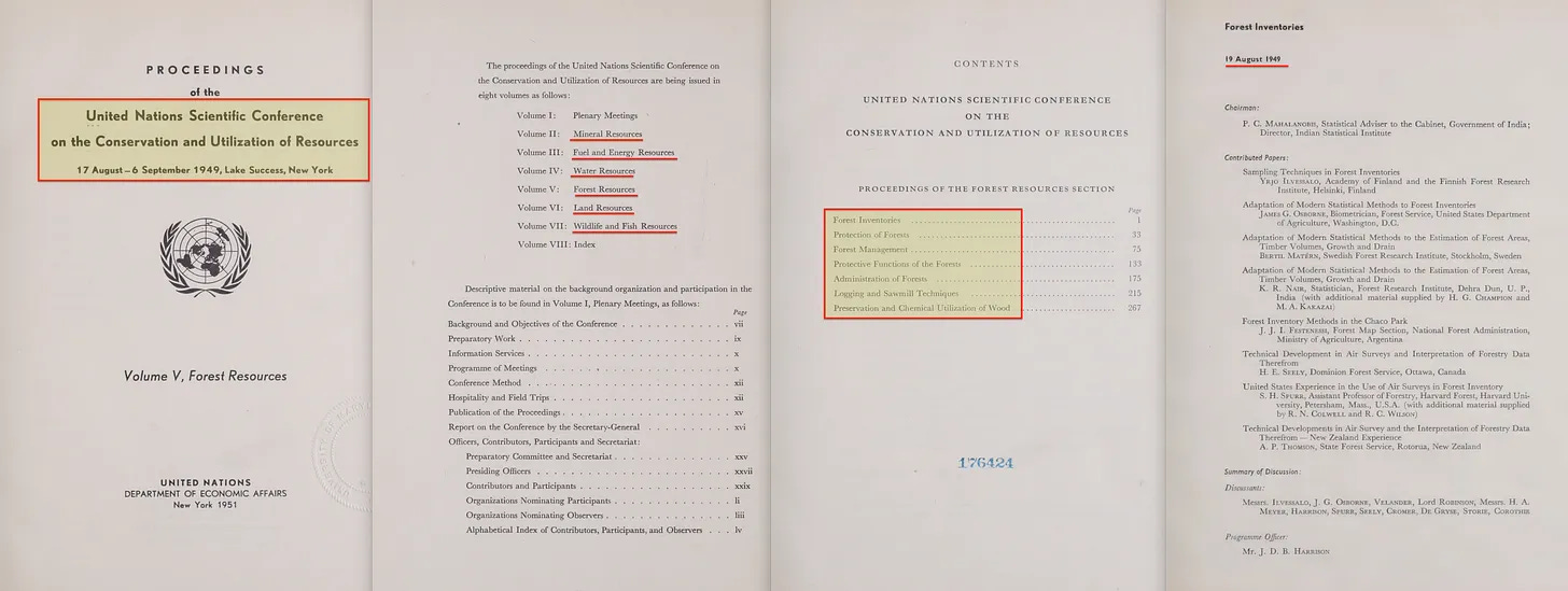 ... από τα οποία στη συνέχεια καταλήγουμε στα «Πρακτικά της Επιστημονικής Διάσκεψης των Ηνωμένων Εθνών για τη Διατήρηση και τη Χρήση των Πόρων» [39] του 1949, τα οποία - με άψογη ακρίβεια - οδηγούν στους ορυκτούς πόρους, τα καύσιμα και την ενέργεια, το νερό, τα δάση, τη γη, την άγρια πανίδα και τους ιχθυογενείς πόρους... το οποίο εμφανίζεται εξαιρετικά κοντά στα σημεία εστίασης του SCOPE αν με ρωτάτε... αλλά επιπλέον δεν ξεχνάμε την ειδική εστίαση στις απογραφές, την προστασία, τη διαχείριση, τις προστατευτικές λειτουργίες και τη διοίκηση των δασών (με τα οποία σχετίζεται ο παρών τόμος)... τα οποία κάνουν ρίμα με τη διάσκεψη της UNESCO για τη βιόσφαιρα του 1968.