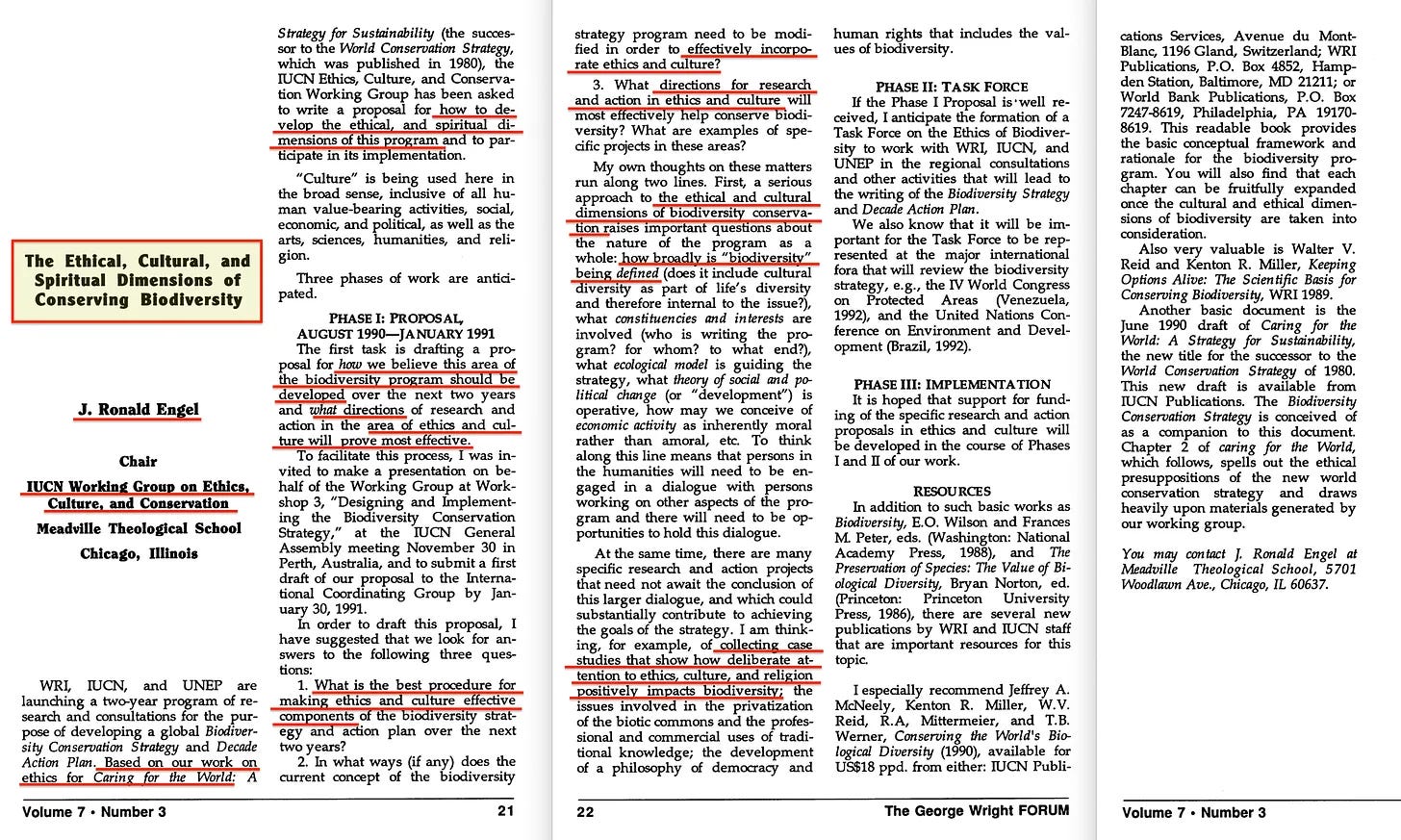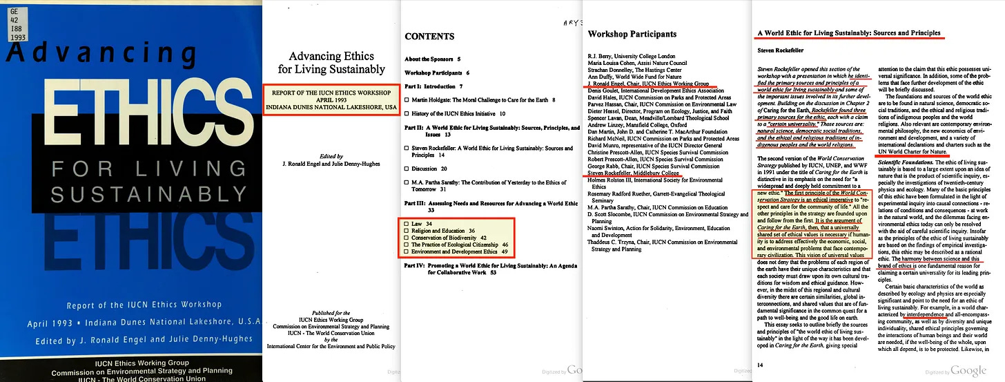 Αλλά ελπίζω ότι θα πρέπει να είναι απολύτως σαφές πόσο κεντρικό ρόλο σε αυτή την αποστολή παίζει πραγματικά η «νέα ηθική». Αν όχι, εδώ είναι ο κόσμος του J Ronald Engel, ο οποίος το 1991 προήδρευσε της Ομάδας Εργασίας της IUCN για την Ηθική, τον Πολιτισμό και τη Διατήρηση [6] -